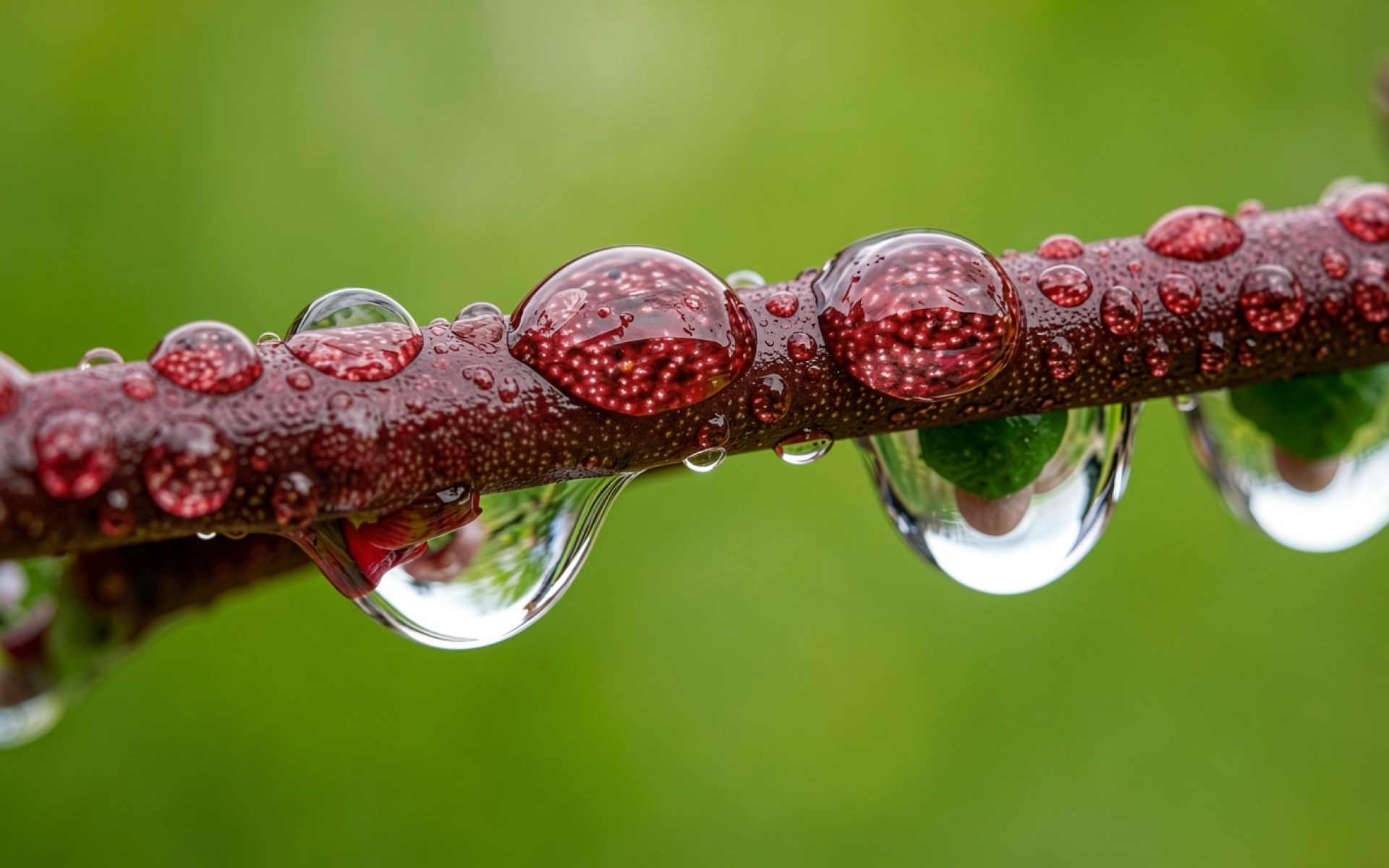 Изображение демонстрирует детальную текстуру коры с выраженными порами и глянцевую поверхность водяных сфер. Освещение создает четкие блики на поверхности капель, которые работают как линзы, преломляя зеленый градиент заднего плана. Контраст между насыщенным красным цветом стебля и размытым фоном подчеркивает объем каждой частицы влаги. На сайте доступен удобный предпросмотр перед скачиванием для оценки качества на экране.