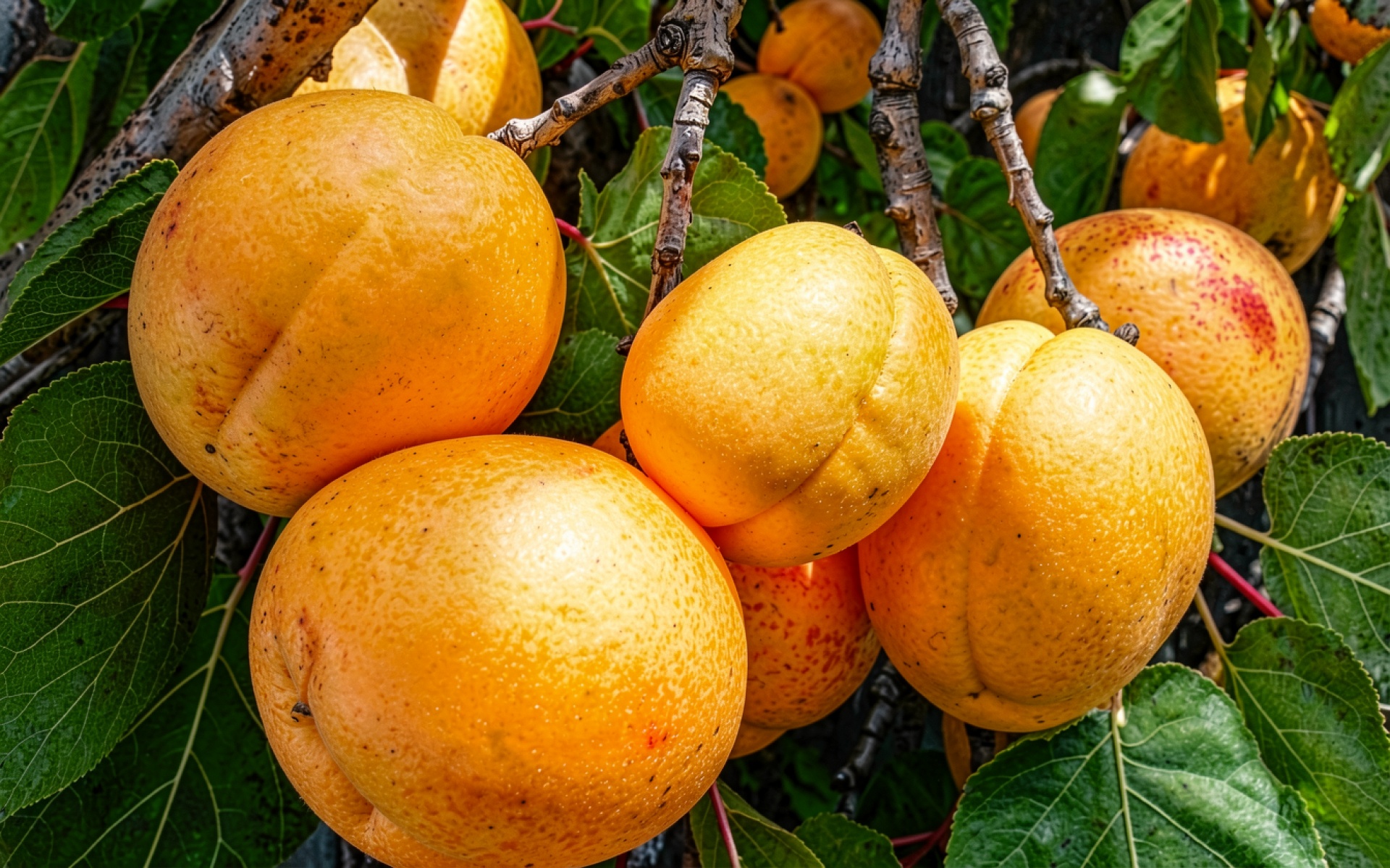 Спелые желтые абрикосы на ветке дерева обои