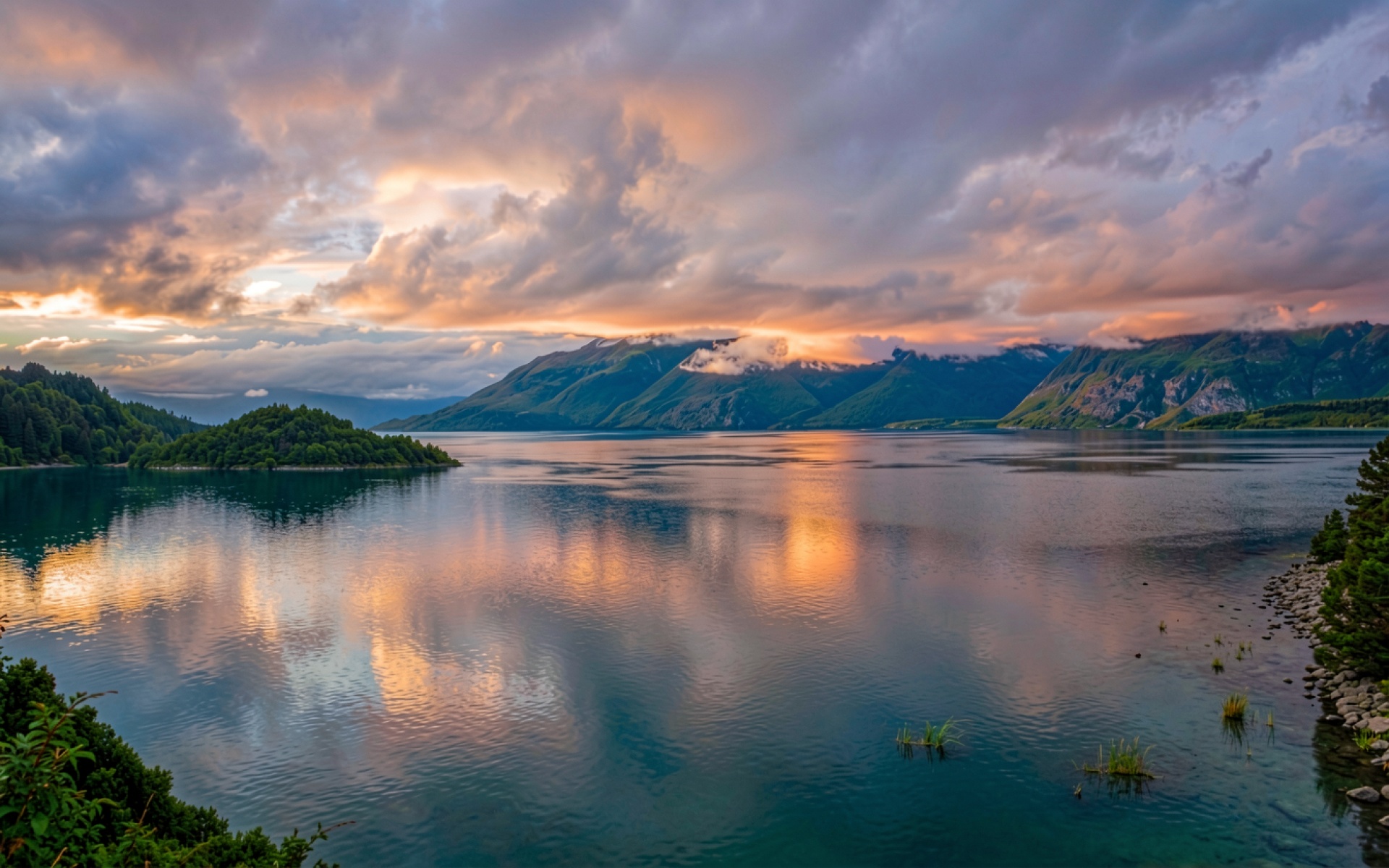 Изображение детально передает гладкую текстуру водной поверхности с четкими зеркальными отражениями. Мягкие градиенты неба переходят от глубокого синего к теплым розовым оттенкам, создавая естественный контраст с темными силуэтами гор и лесистого острова. Освещение подчеркивает рельеф скал и объем облаков, а передний план с прибрежной растительностью добавляет глубины композиции. На сайте доступен удобный предпросмотр перед загрузкой для оценки качества на экране.