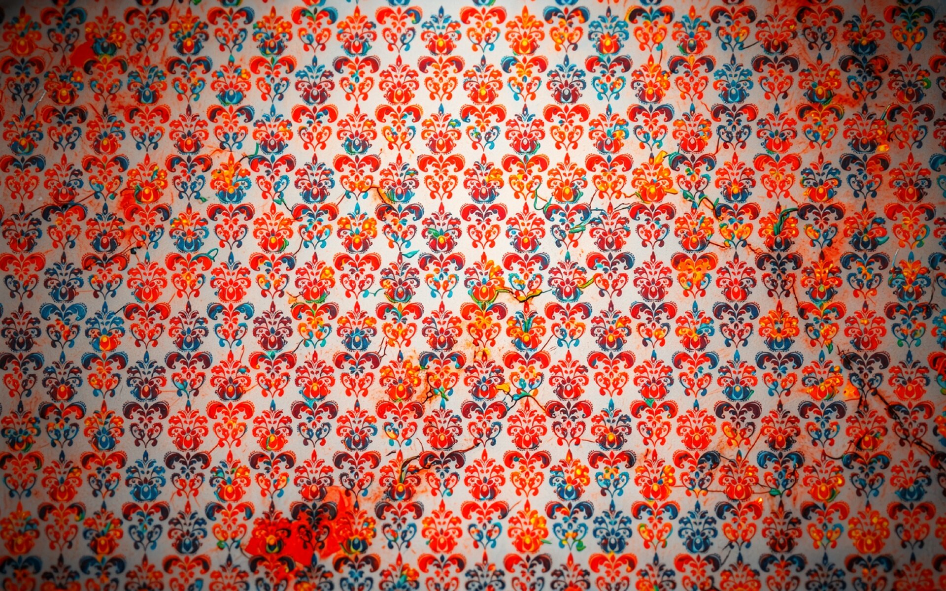 Изображение детально передает текстуру изношенной бумаги с характерными трещинами и отслоениями. Контраст между насыщенным красным пигментом и бледным фоном подчеркивается глубокими тенями в местах разрывов полотна. Мягкие градиенты освещения создают эффект объема, выделяя повторяющиеся элементы орнамента. На сайте доступен удобный предпросмотр перед загрузкой для оценки качества отображения на экране.