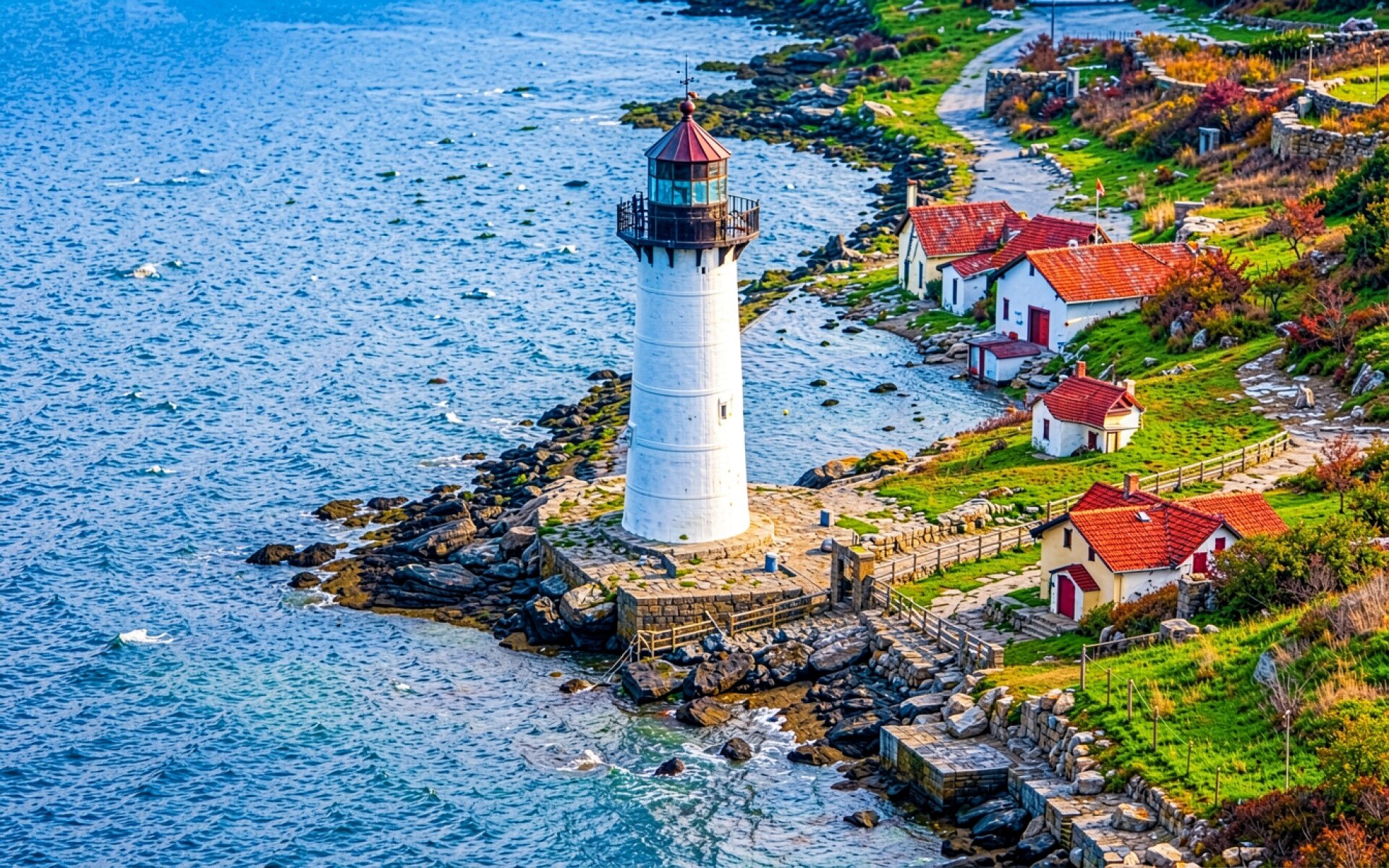 Изображение детально передает текстуру побеленного камня башни и шероховатость прибрежных валунов. Контрастное освещение создает четкие тени у основания строений, а градиенты синего цвета в морской воде подчеркивают глубину сцены. На сайте доступен удобный предпросмотр перед загрузкой для оценки качества на экране.