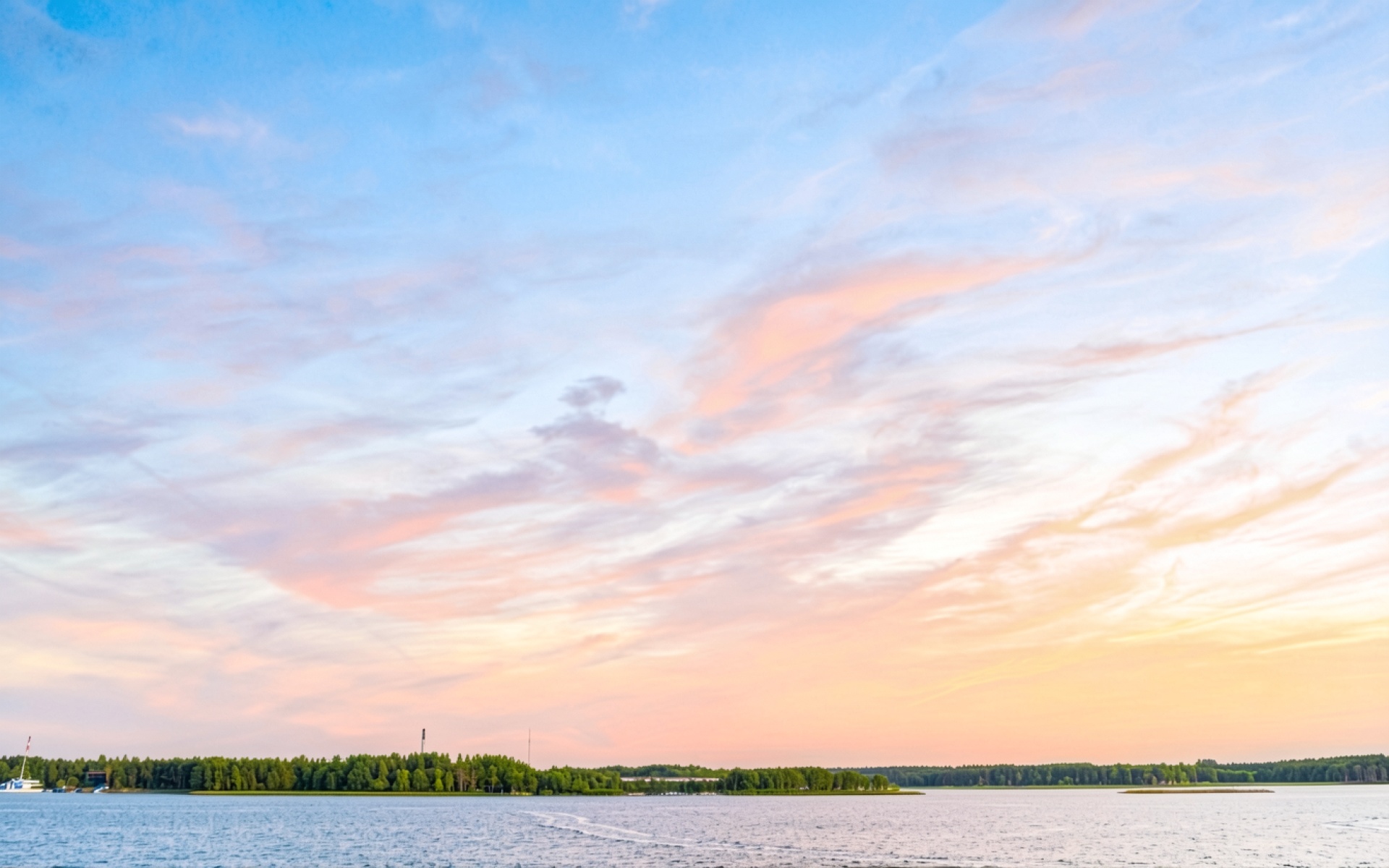 Изображение характеризуется мягкими градиентами неба, где переходят холодные голубые тона в теплые пастельные оттенки. Текстура перистых облаков передана детально, создавая ощущение объема и динамики воздуха. Освещение имитирует золотой час, что влияет на контраст между темным силуэтом лесного массива и светлой гладью воды с легкой рябью. На сайте доступен удобный предпросмотр перед загрузкой для оценки качества на экране.