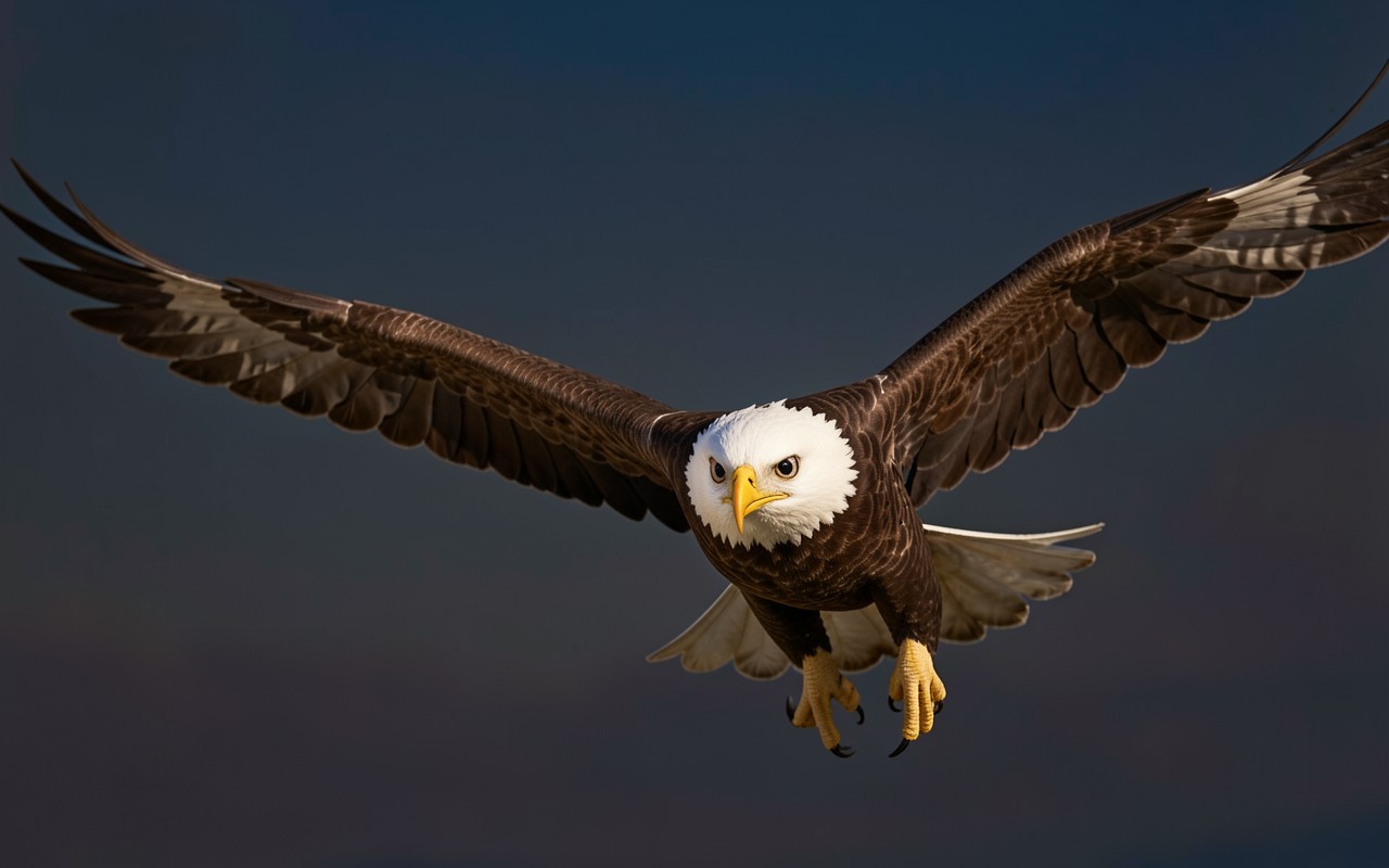 Изображение детально передает структуру оперения и остроту когтей хищника. Контрастное освещение подчеркивает белизну головы и создает глубокие тени под размахом крыльев, а плавный градиент темного фона акцентирует внимание на центральном объекте. На сайте доступен удобный предпросмотр перед скачиванием для оценки качества отображения на экране.