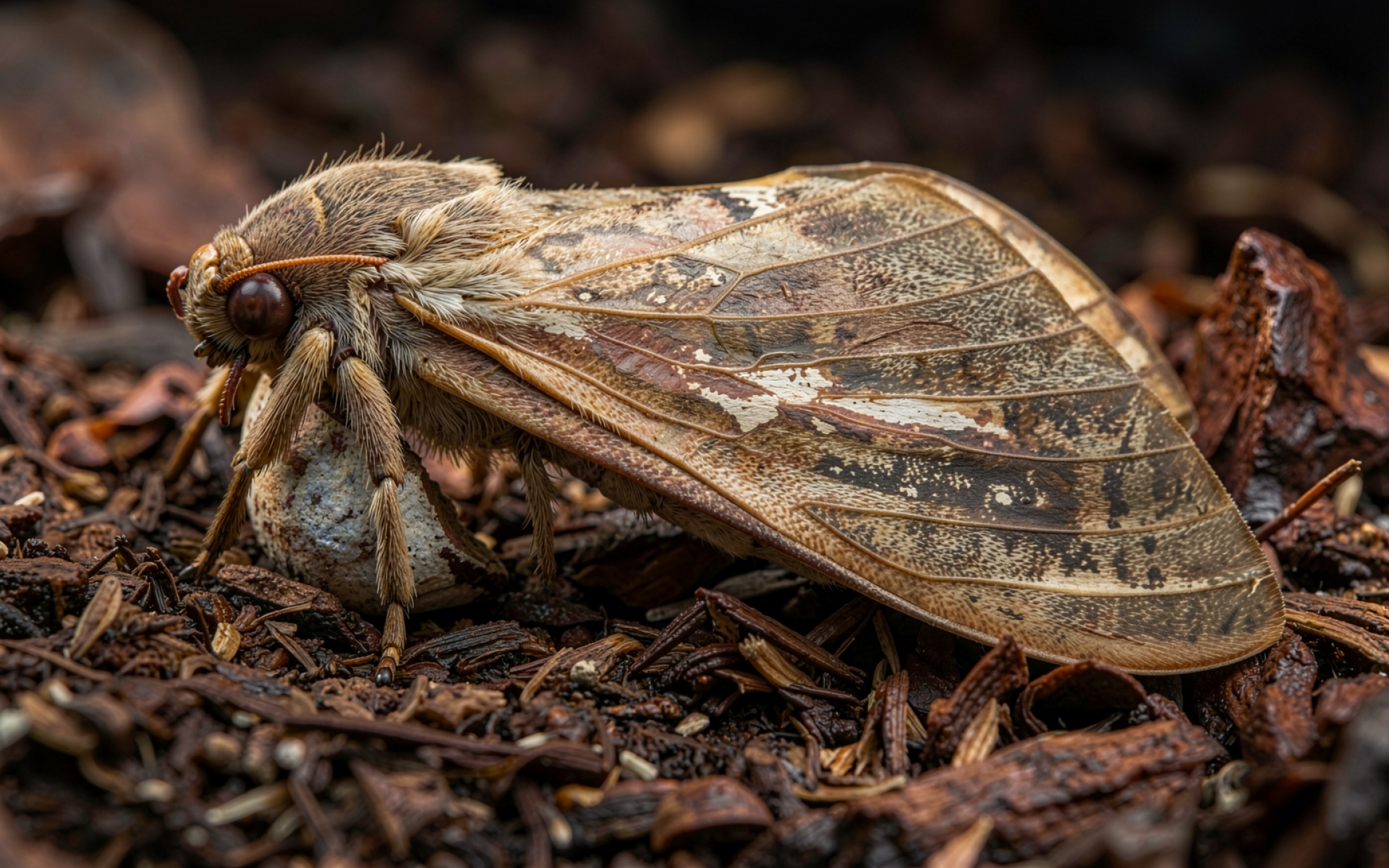 Данный JPG-файл характеризуется минимальной степенью сжатия для сохранения микротекстуры крыльев. Изображение представлено в цветовом пространстве sRGB с глубиной цвета 8 бит на канал, что обеспечивает корректную передачу охристых и землистых оттенков. Высокая детализация позволяет рассмотреть ворсинки на голове насекомого без эффекта бэндинга в темных участках фона. Файл полностью совместим с любым современным графическим редактором и просмотрщиком.