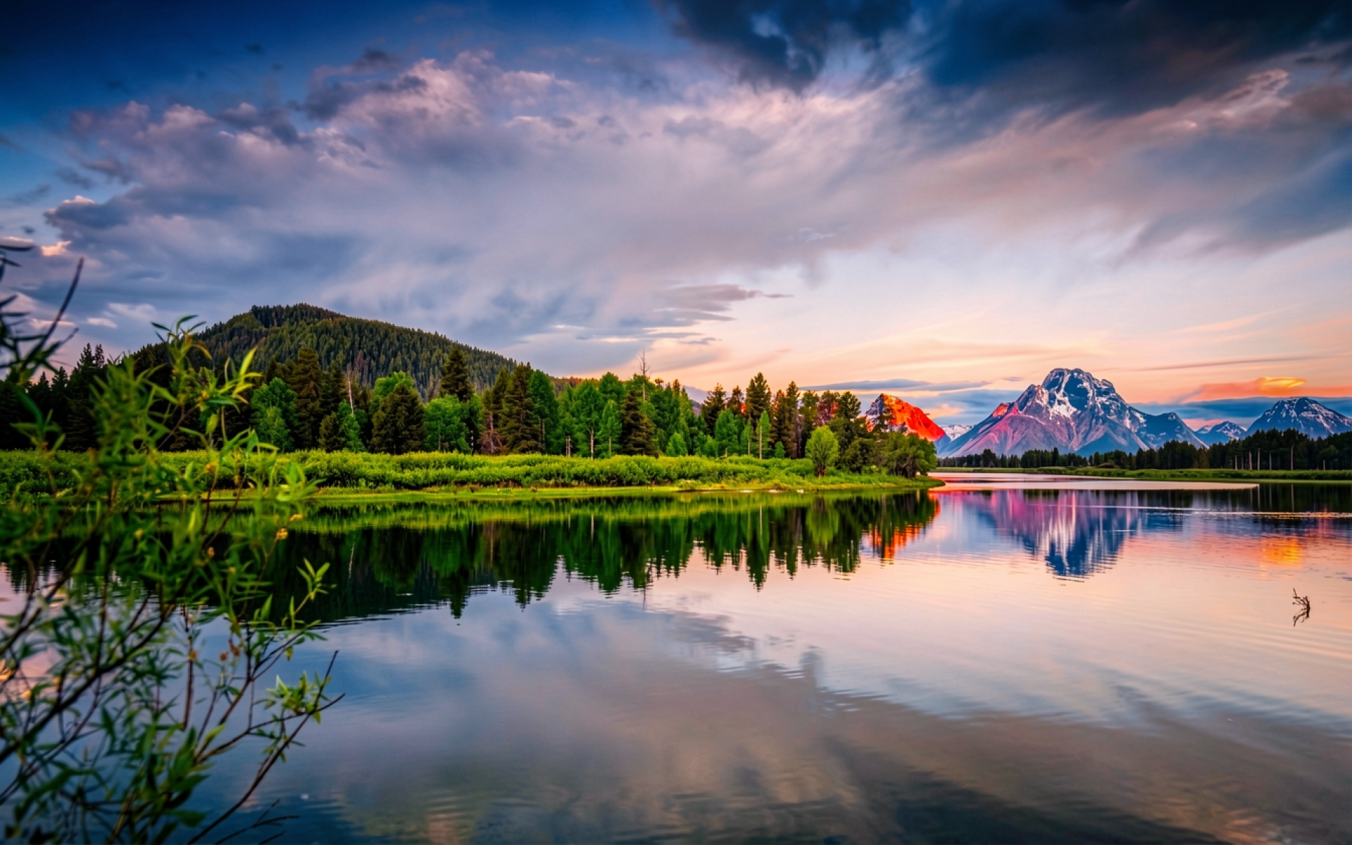Изображение характеризуется глубокой проработкой текстур хвойного леса и четкими гранями скалистых вершин. Освещение создает мягкие переходы между теплыми оранжевыми оттенками неба и холодными синими тенями на склонах гор. Градиенты поверхности воды точно передают зеркальное отражение облаков и растительности, а акценты света подчеркивают объем рельефа. На сайте доступен удобный предпросмотр перед скачиванием для оценки качества на экране.