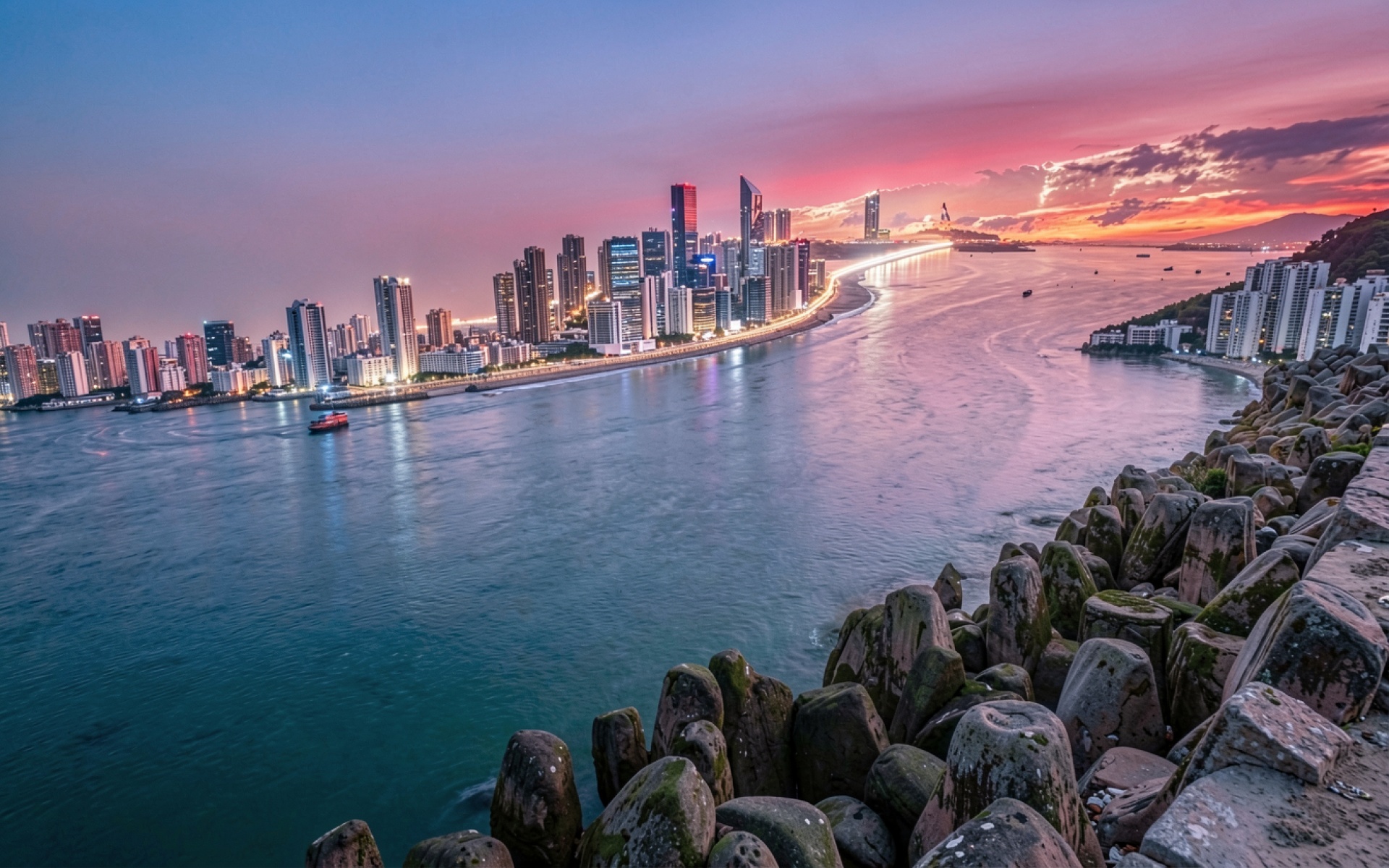 Изображение детально передает текстуру бетонных волнорезов на переднем плане и гладкую поверхность воды с мягкими отражениями городских огней. Освещение соответствует сумеркам, где розовые и фиолетовые оттенки неба плавно переходят в глубокий синий цвет. Акценты расставлены на геометрии небоскребов и ритме городской застройки вдоль береговой линии. На сайте предусмотрен удобный предпросмотр перед скачиванием для оценки качества на экране.
