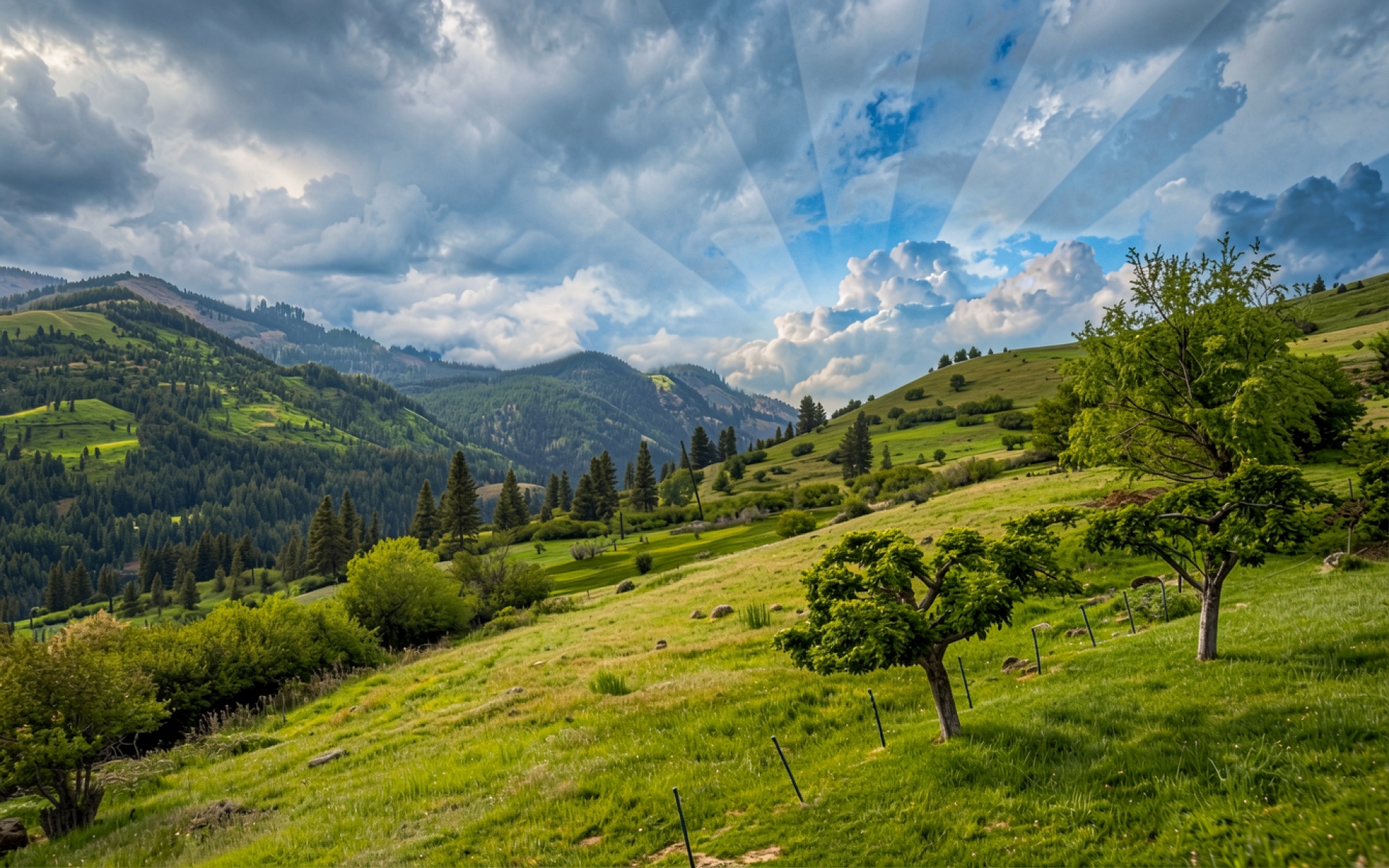 Изображение отличается детальной проработкой текстуры травы и листвы деревьев на переднем плане. Освещение создает мягкие переходы между ярко-зелеными участками склонов и глубокими тенями в лесных массивах. Градиенты неба плавно переходят от темно-серых грозовых облаков к светлым пробивающимся лучам, что подчеркивает объем горного рельефа. На сайте доступен удобный предпросмотр перед скачиванием для оценки качества на экране.