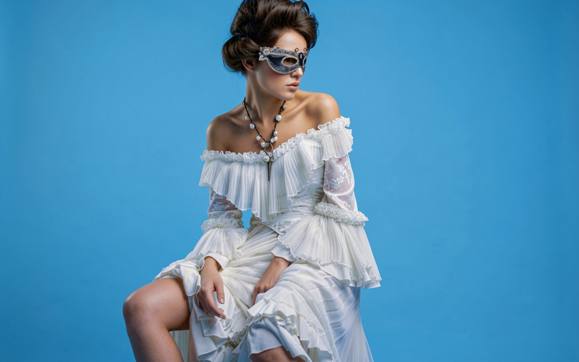 Изображение отличается детальной проработкой текстуры ткани и кружева, где мягкие складки платья создают естественные переходы света и тени. Освещение акцентирует внимание на блеске маски и жемчужных бус, создавая контраст с однотонным голубым фоном. Плавные градиенты заднего плана подчеркивают силуэт модели без визуального шума. На сайте доступен удобный предпросмотр перед скачиванием для оценки качества на экране.