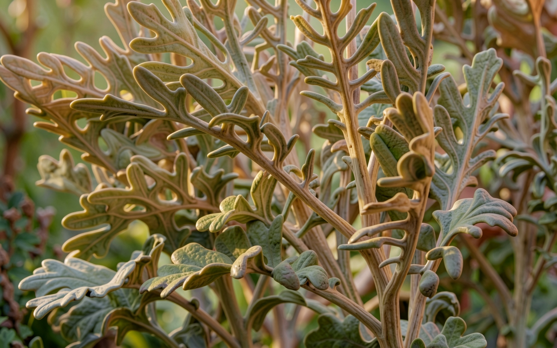 Серебристые листья цинерарии в теплом солнечном свете обои