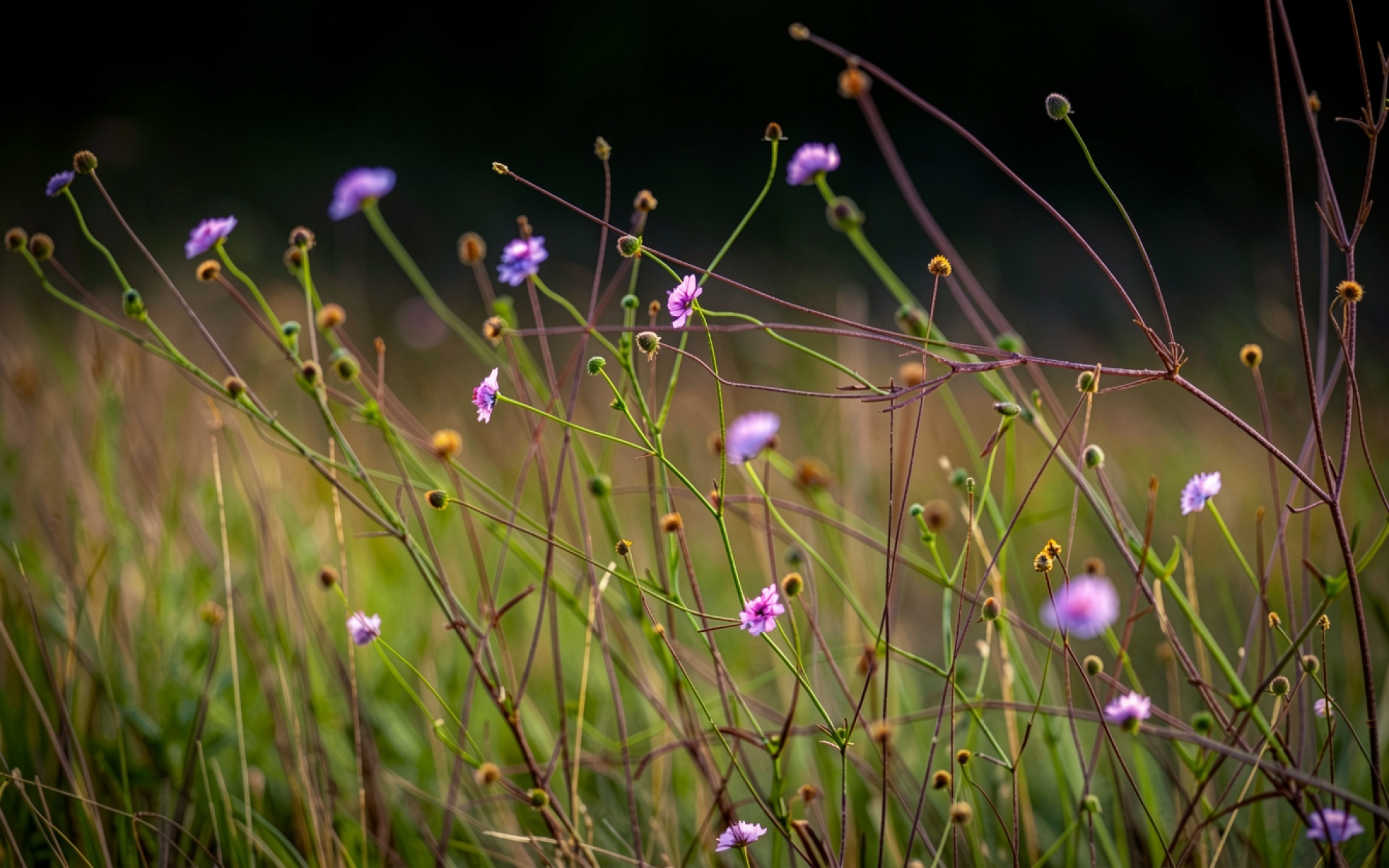Фиолетовые полевые цветы в темном вечернем лесу обои