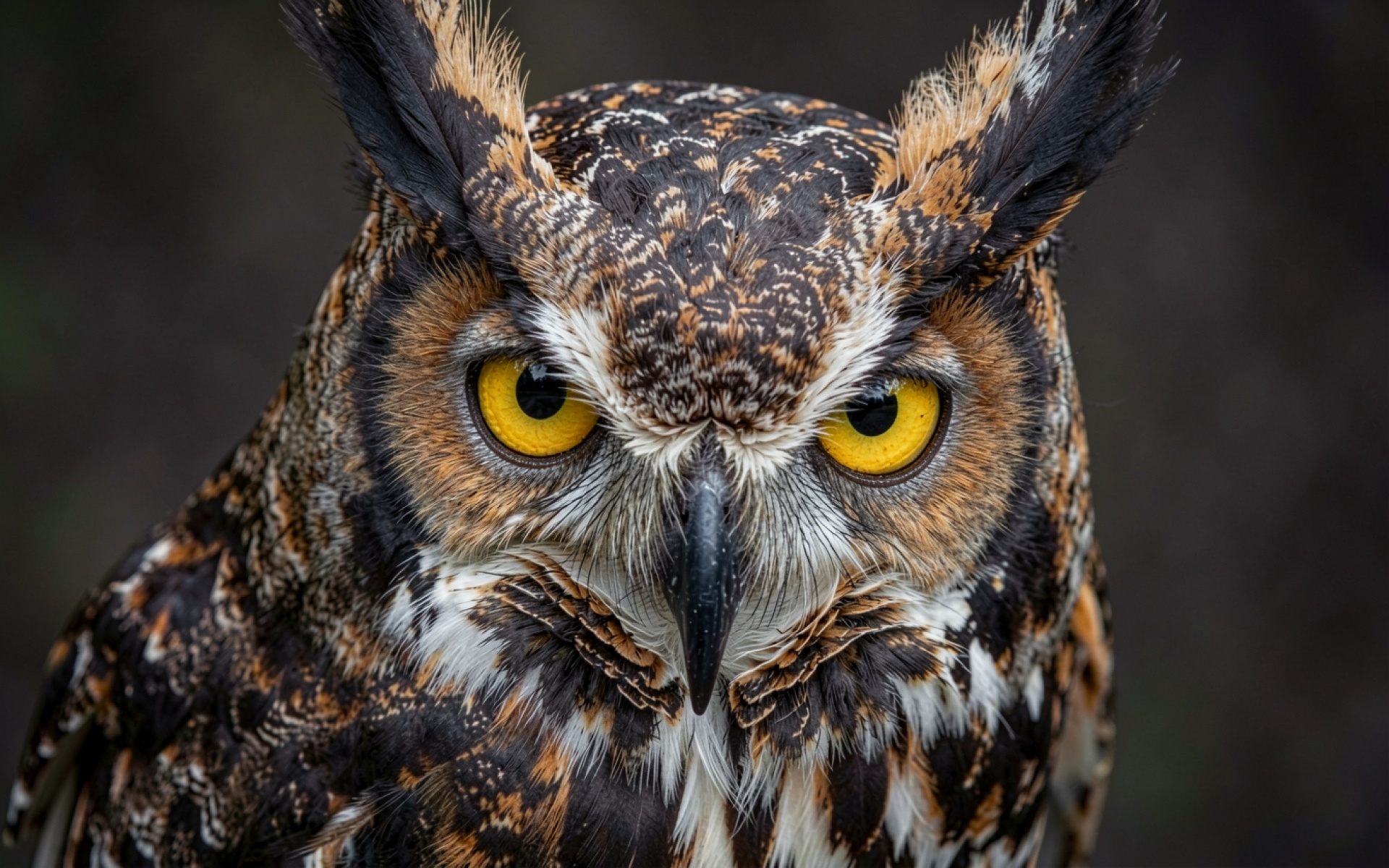 Доступны для скачивания JPG обои Портрет вирна совы с желтыми глазами. Почему стоит скачать их? эта JPG версия сохраняет все оттенки теней и света.