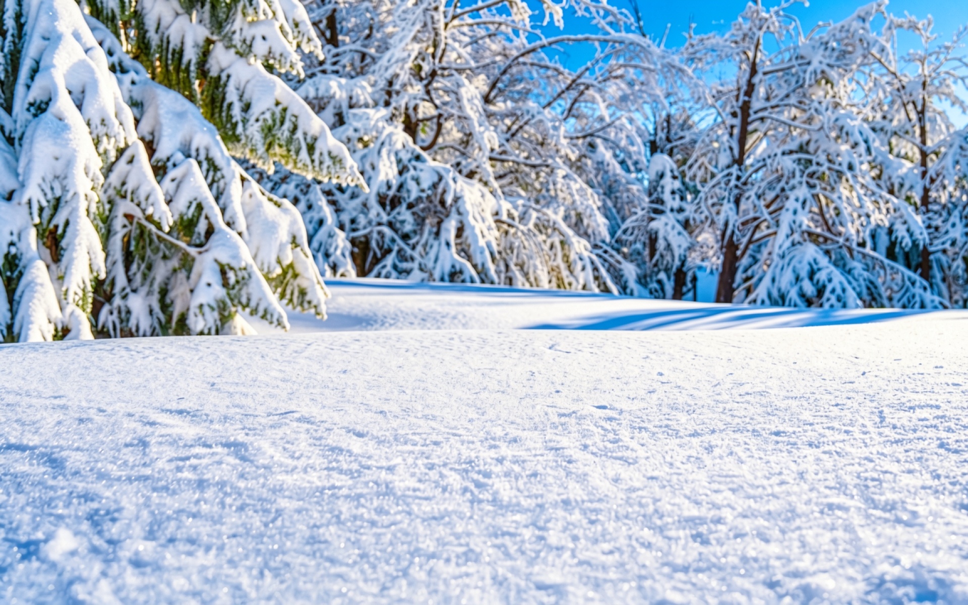 Изображение детально передает кристаллическую структуру свежевыпавшего снега и ворсистую текстуру хвои. Контрастное освещение создает четкие границы между ослепительно белыми участками и глубокими синими тенями на поверхности сугробов. Плавные градиенты голубого неба подчеркивают чистоту зимнего воздуха, а блики на ветвях добавляют сцене объема. На сайте доступен удобный предпросмотр перед загрузкой для оценки качества на экране.