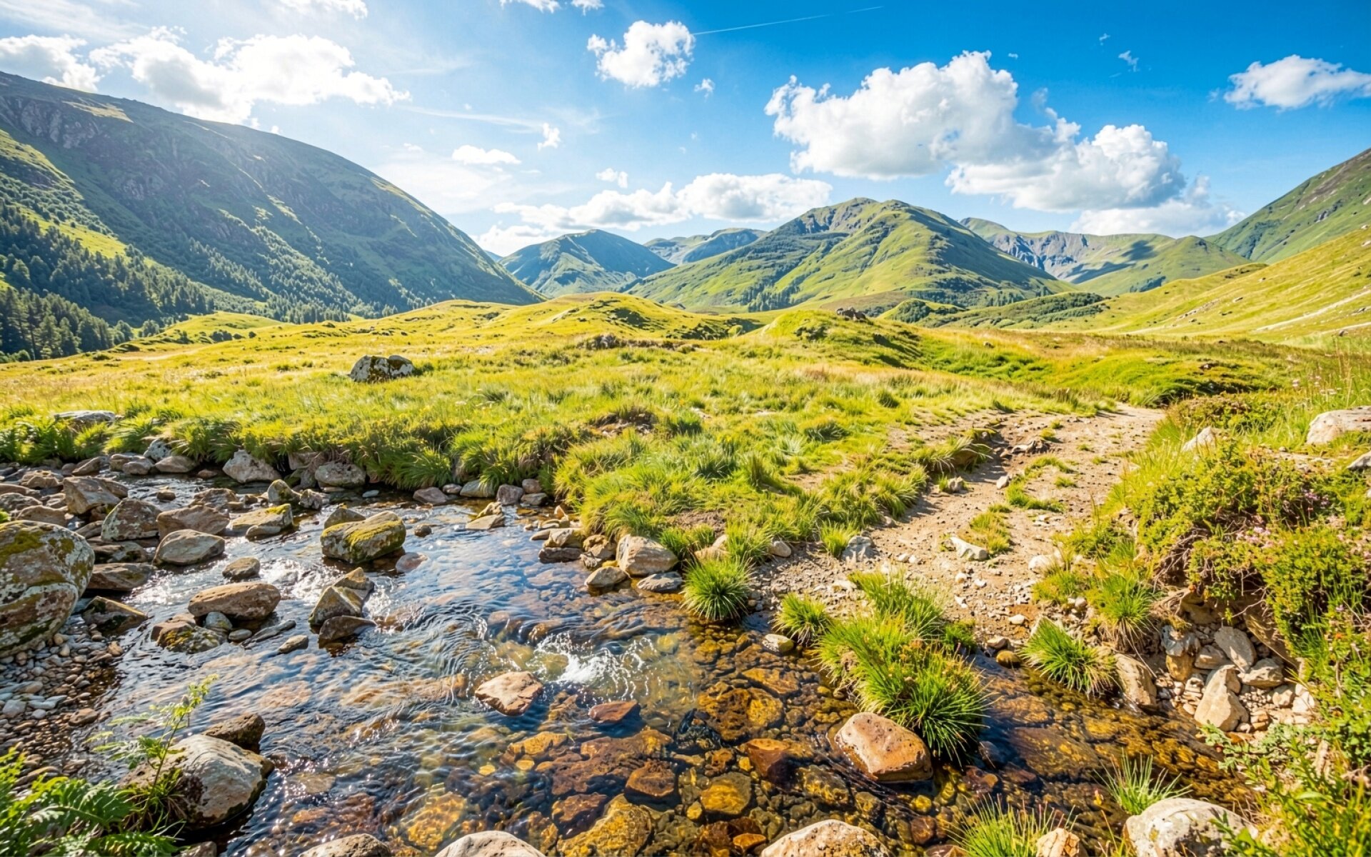 Горный пейзаж с ручьем в солнечный день обои