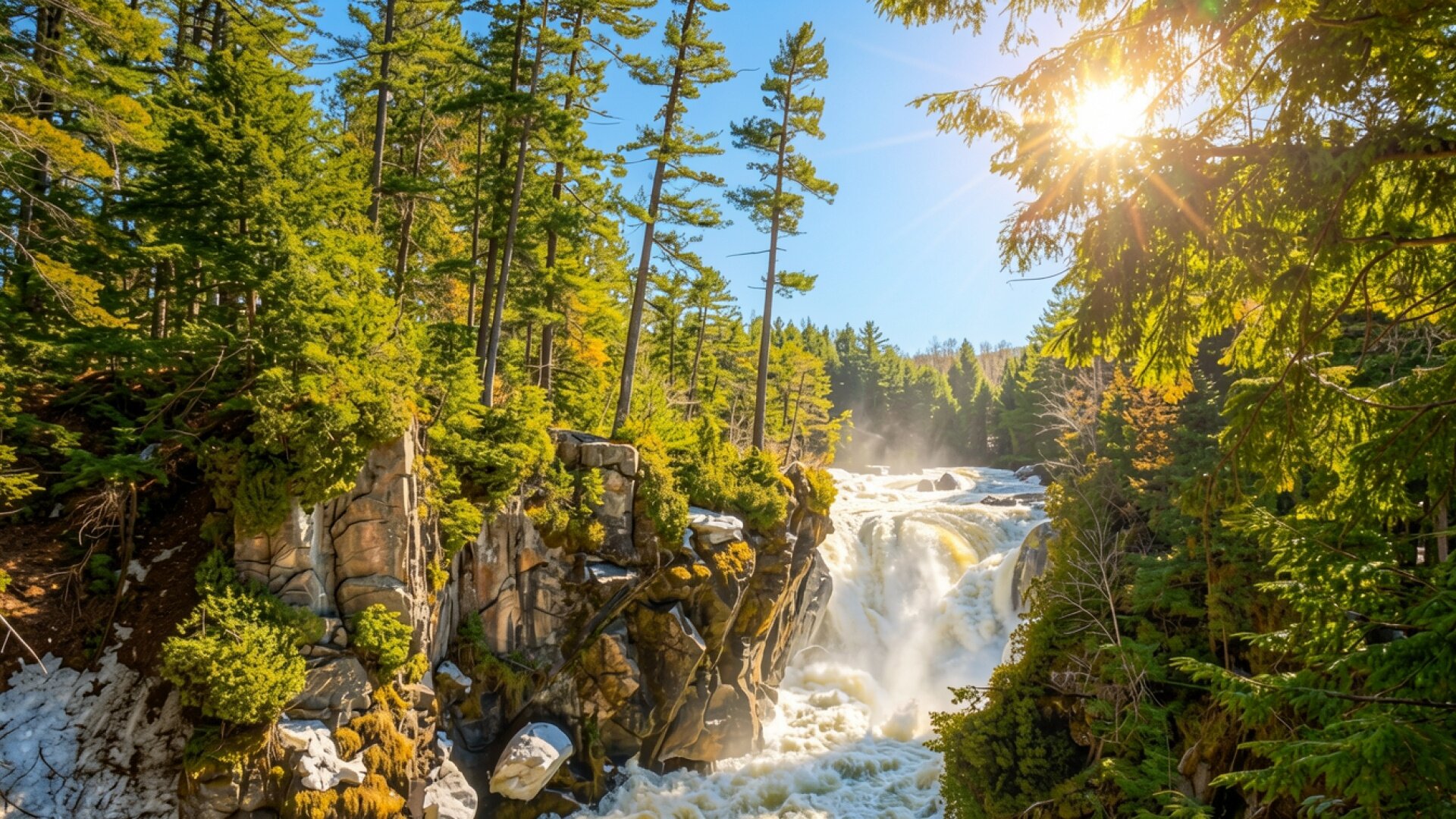 Изображение детально передает текстуру мокрых скал и пенную массу падающей воды. Контрастное освещение создает выраженные блики на поверхности потока и глубокие тени в расщелинах камней. Градиенты неба плавно переходят от насыщенного голубого к яркому белому в точке расположения солнца. На сайте доступен удобный предпросмотр перед загрузкой для оценки качества отображения на экране.