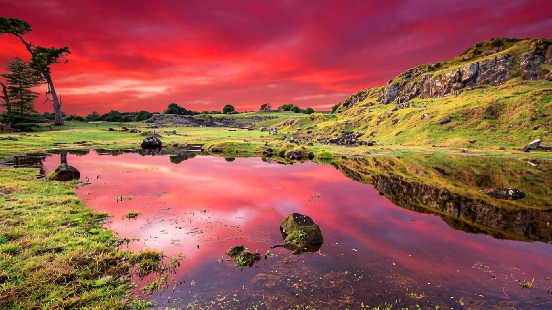 Изображение детально передает текстуру прибрежной травы и шероховатость горных пород. Освещение характеризуется глубокими алыми оттенками неба, которые создают мягкие блики на поверхности воды. Контрастные тени подчеркивают рельеф холмов, а плавные переходы цвета в небе обеспечивают визуальную глубину сцены. На сайте предусмотрен удобный предпросмотр перед загрузкой для оценки качества на экране.