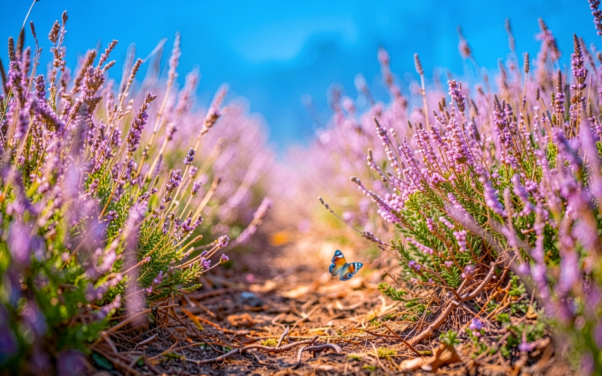 Изображение детально передает текстуру крыльев насекомого и мелкие соцветия растений. Контраст между теплыми оранжевыми тонами и холодным фиолетовым фоном создает глубокий визуальный объем. Мягкие градиенты синего неба плавно переходят в размытые линии горизонта, а акценты света подчеркивают каждую ворсинку на стеблях вереска. На сайте доступен удобный предпросмотр перед скачиванием для оценки качества на экране.