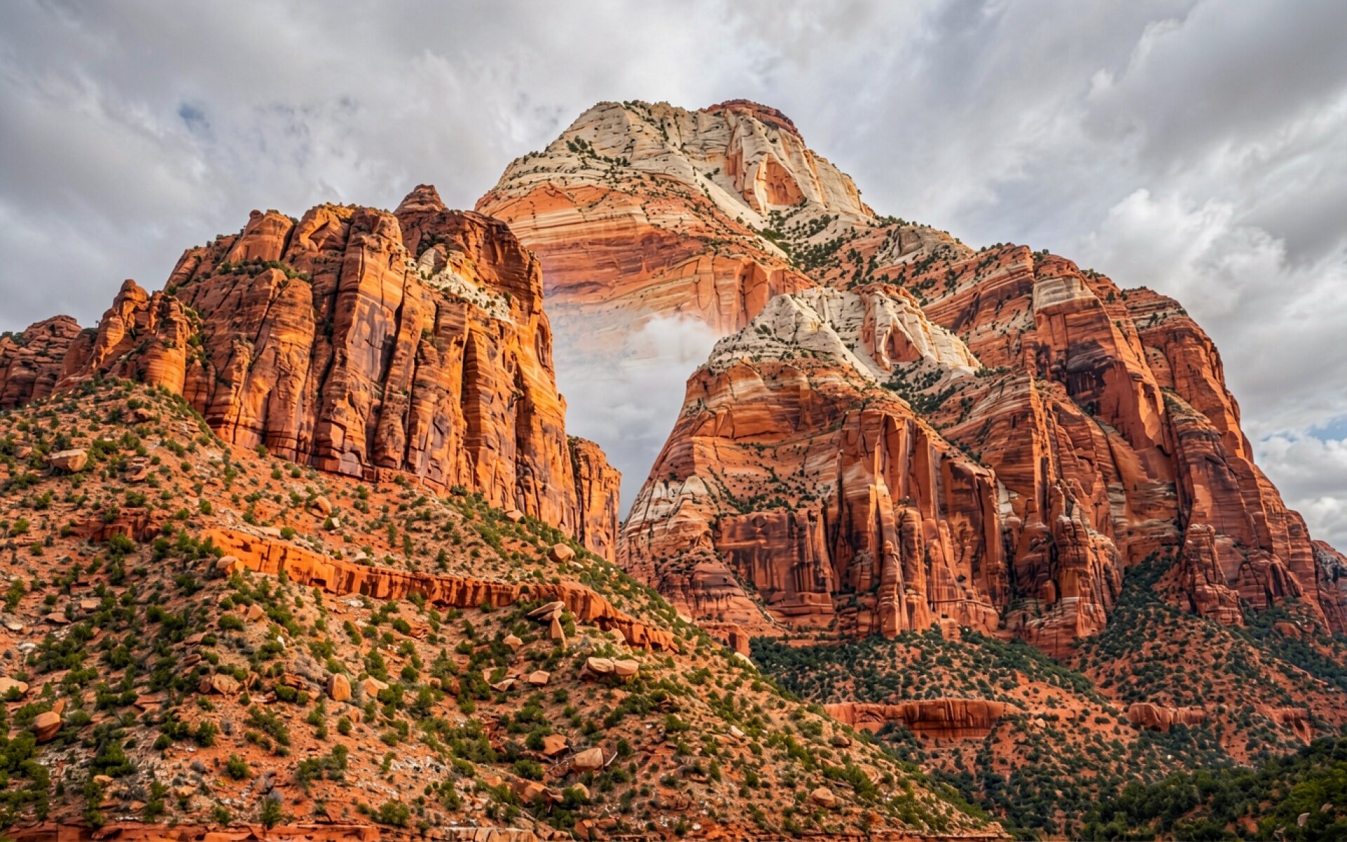 Здесь вы можете скачать JPG обои под названием 'Красные скалы каньона под пасмурным небом', и почему вы должны это сделать: изображение прошло минимальное сжатие, что позволило сохранить все мелкие детали.