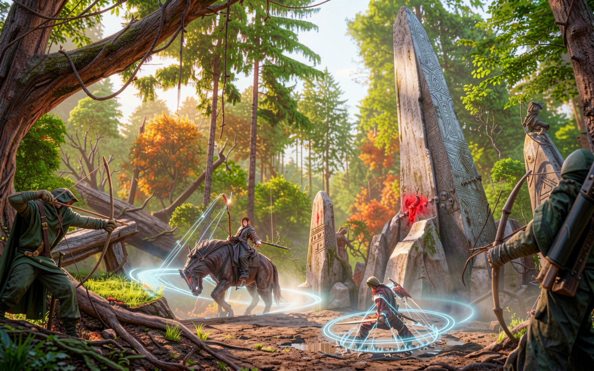Изображение отличается детальной проработкой текстуры шерсти коня и ткани одежды всадника. Освещение создает мягкие градиенты на фоне деревьев, а светящиеся магические круги формируют контрастные блики и глубокие тени на поверхности земли. Фон характеризуется плавным переходом от насыщенной зелени к золотистым оттенкам листвы. На сайте доступен удобный предпросмотр перед загрузкой для оценки качества на экране.