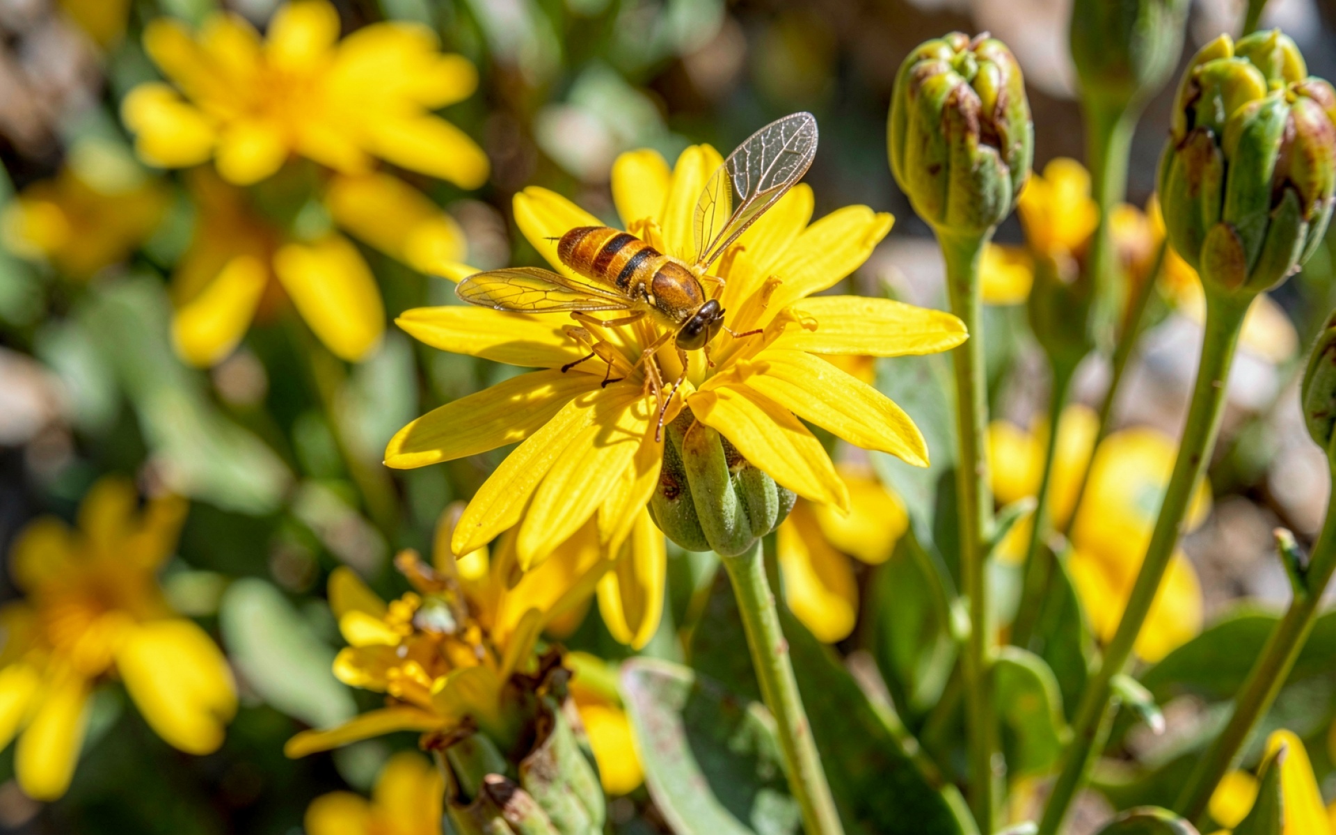 Шмель на желтом цветке в солнечный день обои