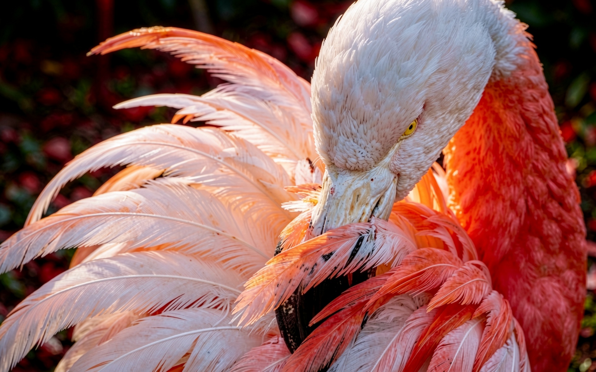 Изображение детально передает структуру оперения птицы, где каждый контур пера подчеркнут мягким боковым светом. Контраст между насыщенным розовым цветом и глубокими темными тонами заднего плана создает выразительный объем. Градиенты на шее переходят от светлых оттенков к более плотным, а блики на глазу добавляют сцене реализма. На сайте доступен удобный предпросмотр перед скачиванием для оценки качества на экране.