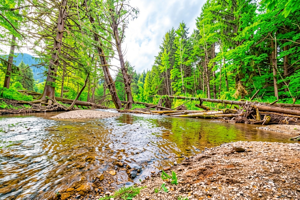 Изображение детально передает текстуру мокрой гальки на дне и шероховатость коры поваленных деревьев. Освещение распределено равномерно, создавая мягкие блики на поверхности воды и глубокие тени в гуще хвои. Градиенты фона плавно переходят от насыщенного изумрудного цвета листвы к светло-голубому оттенку неба. На сайте доступен удобный предпросмотр перед загрузкой для оценки качества на экране.
