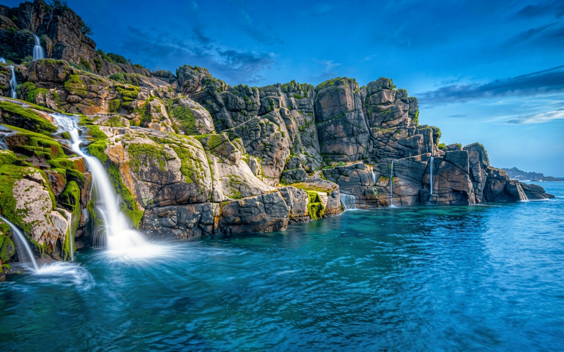 Изображение детально передает текстуру влажного камня и пористую структуру мха. Освещение подчеркивает контраст между белыми потоками воды и глубокими синими градиентами морской глади. Мягкие блики на поверхности скал создают объем, а плавные переходы цвета в небе добавляют глубины композиции. На сайте доступен удобный предпросмотр перед загрузкой для оценки качества на экране.