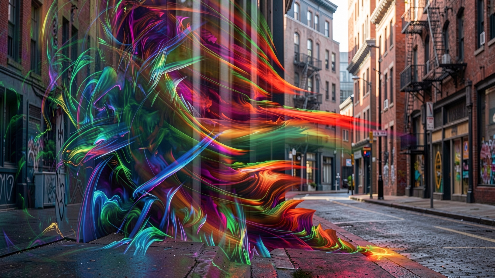 Абстрактные неоновые линии в городском переулке обои