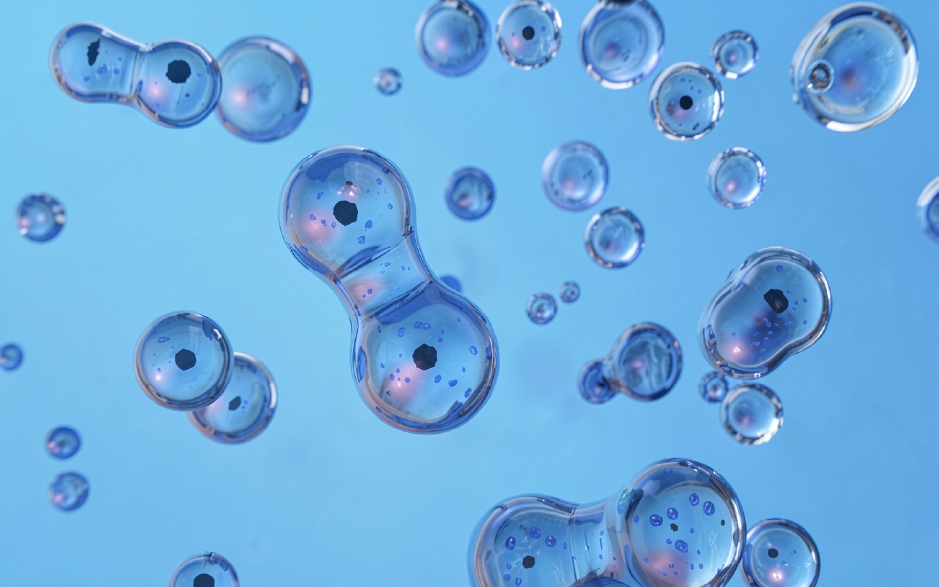 Изображение характеризуется сложной игрой света внутри прозрачных объектов. Стеклянные поверхности имеют четкие блики и мягкие градиенты, которые создают объем каждой сферы. Внутренние темные вкрапления добавляют глубины, а плавные переходы голубого фона подчеркивают чистоту композиции. На сайте доступен удобный предпросмотр перед скачиванием для оценки качества на экране.