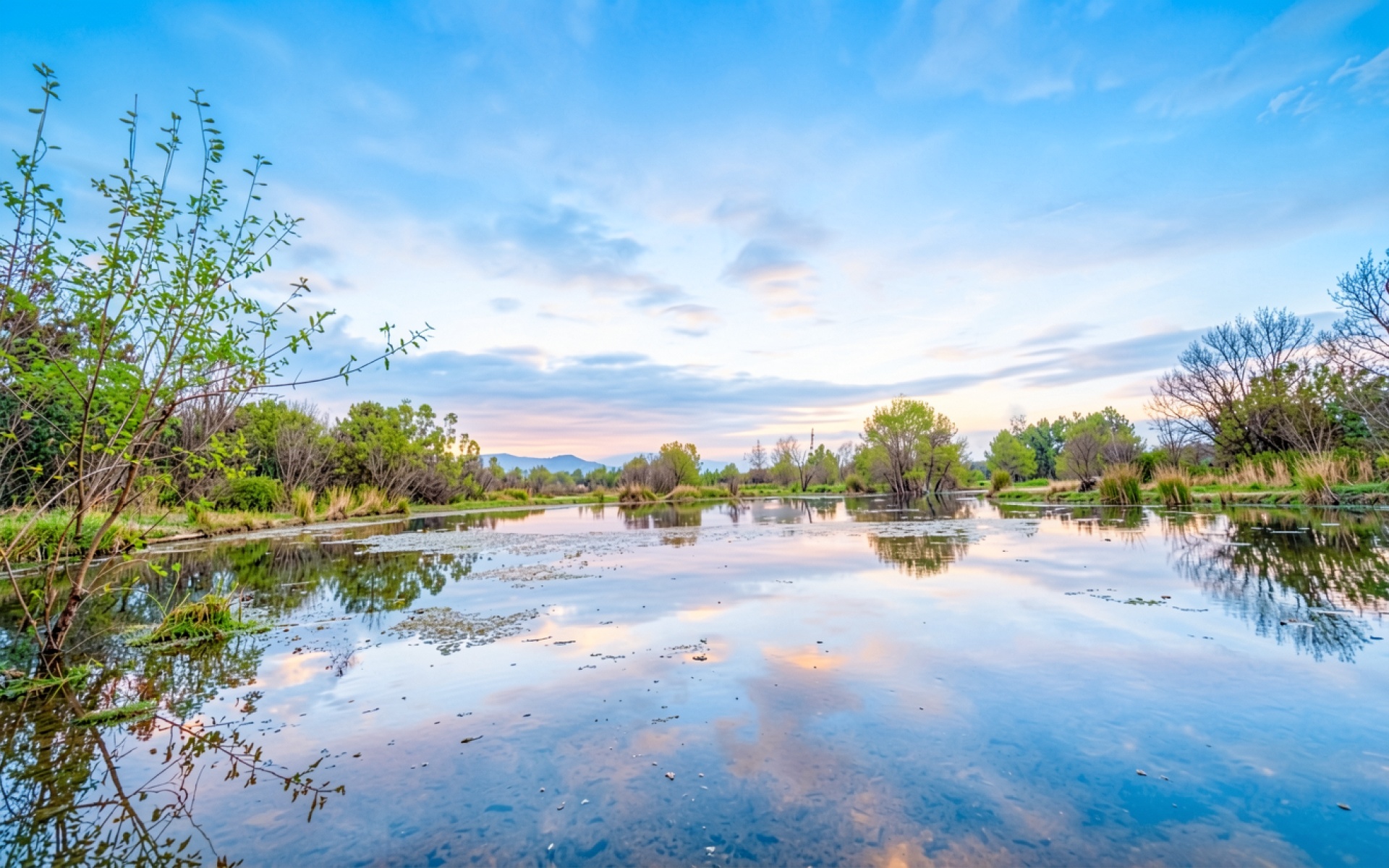 Изображение характеризуется мягкими градиентами закатного неба и зеркальным отражением водной глади. Особое внимание уделено текстуре прибрежной растительности и тонким переходам между глубоким синим и пастельными оттенками горизонта. Контрастные тени в кустарниках подчеркивают объем сцены, а блики на поверхности воды создают эффект глубины. Сайт предоставляет удобный предпросмотр перед загрузкой для оценки качества на вашем экране.