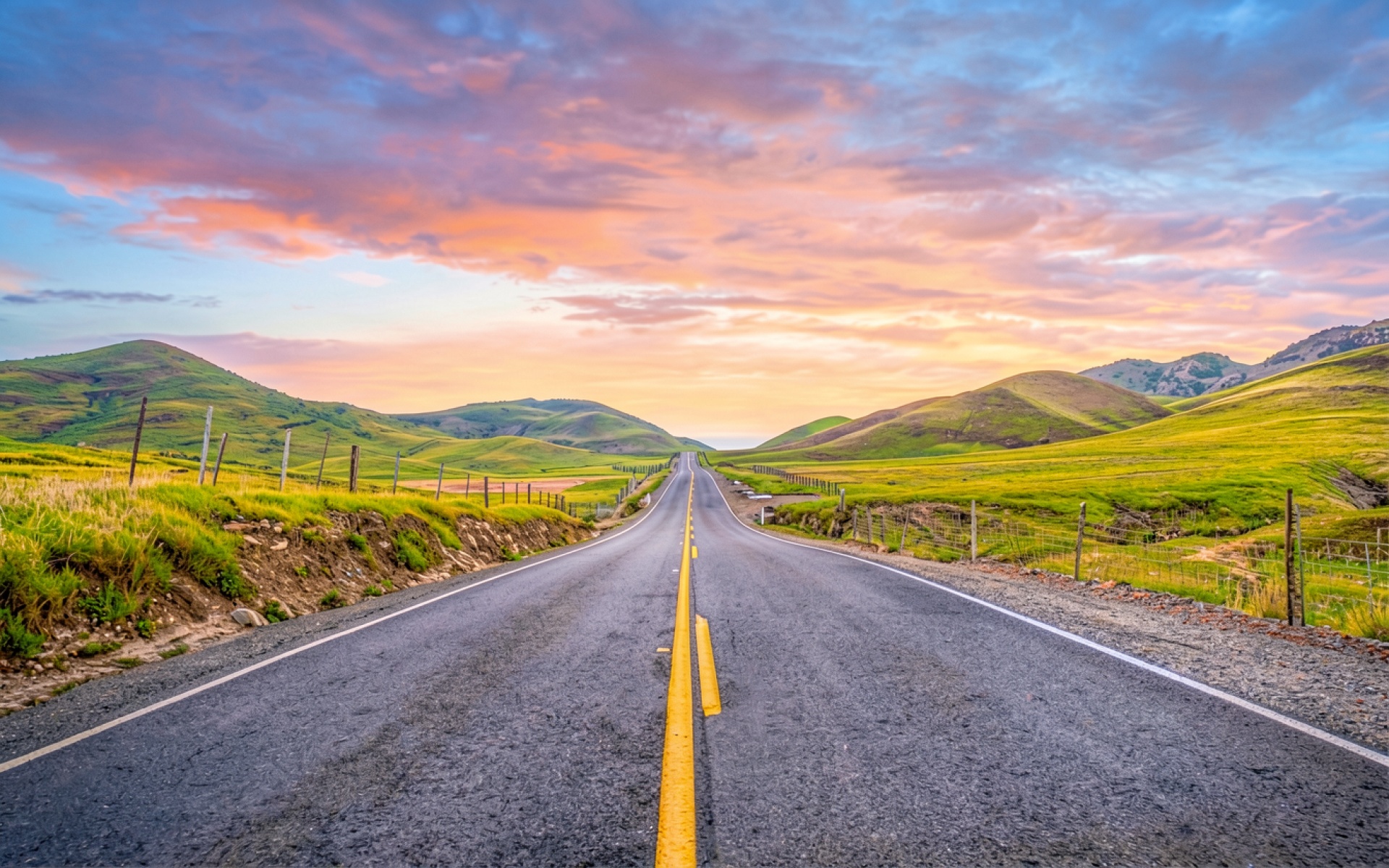 Изображение детально передает зернистую текстуру дорожного покрытия и четкие границы желтой разделительной полосы. Мягкий свет заходящего солнца создает плавные градиенты на склонах холмов, подчеркивая объем рельефа через игру света и глубоких теней в низинах. Небо демонстрирует переход от насыщенного оранжевого к приглушенному синему, что создает естественный контраст с сочной зеленью травы. На сайте доступен удобный предпросмотр перед скачиванием для оценки качества на экране.