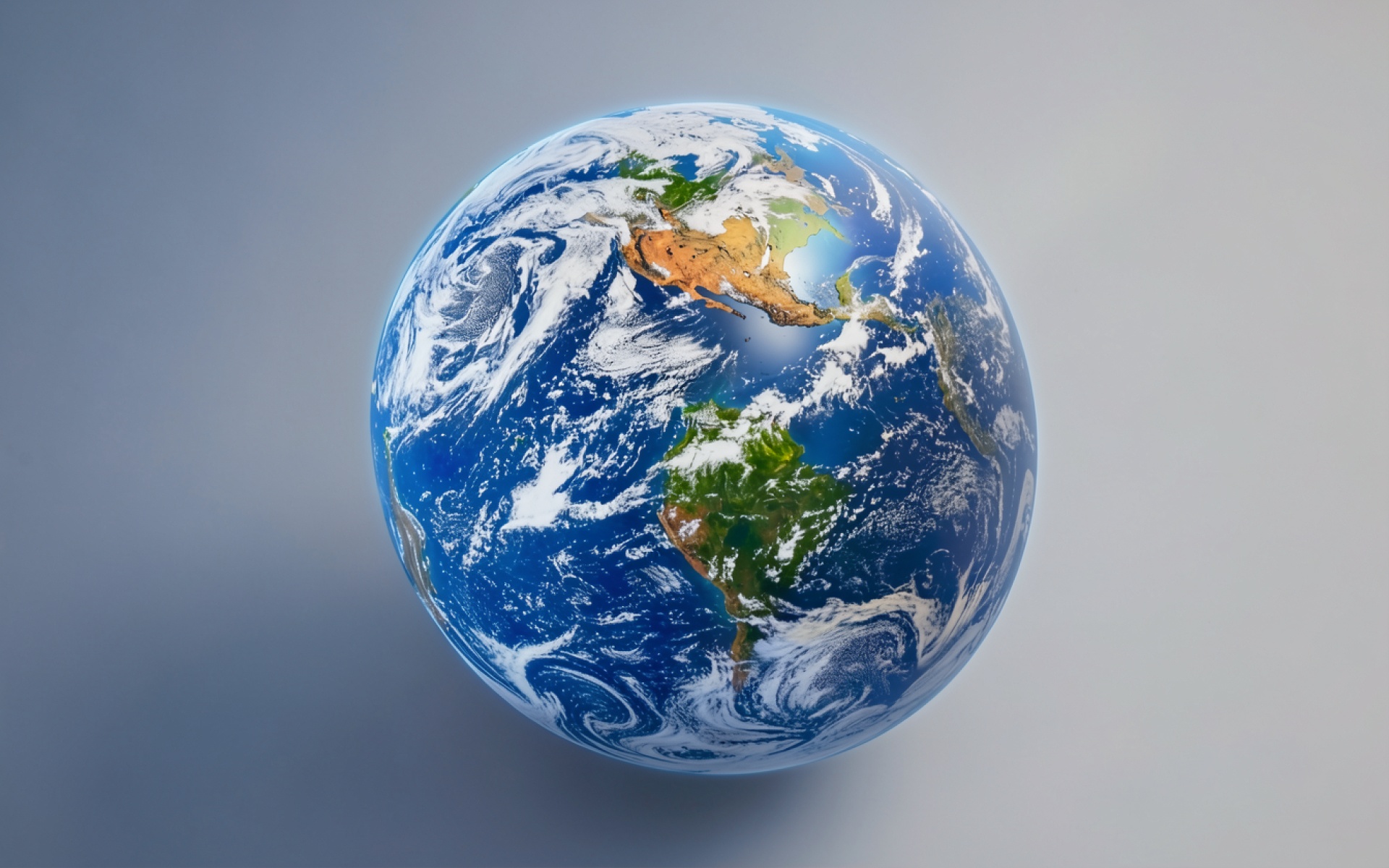Изображение детально передает текстуру облачного покрова и рельеф континентов. Освещение создает мягкий градиент от ярко-белых бликов на атмосфере до глубоких синих тонов океанов. Контраст между насыщенным шаром и нейтральным серым фоном подчеркивает объем объекта. На сайте доступен удобный предпросмотр перед скачиванием для оценки качества на экране.