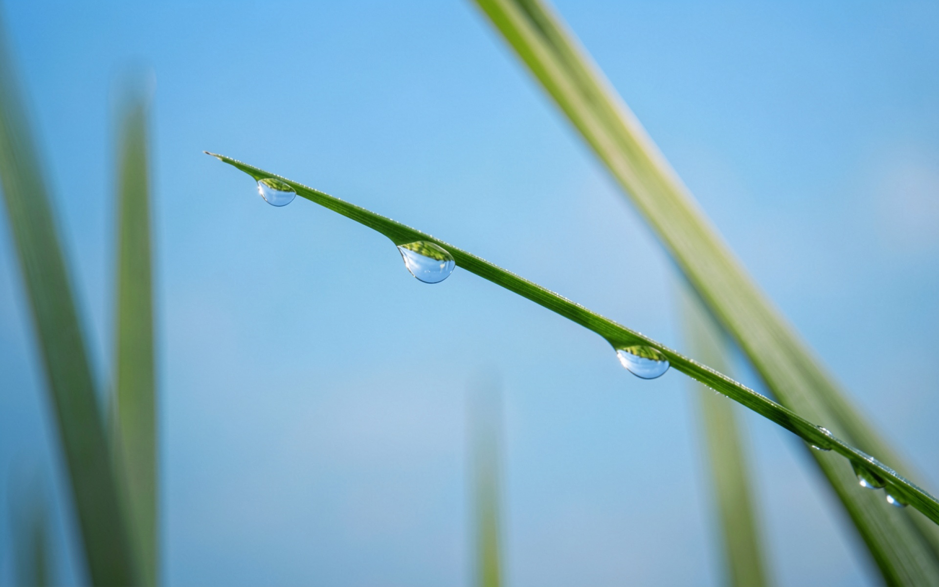 Капли росы на зеленом стебле травы обои