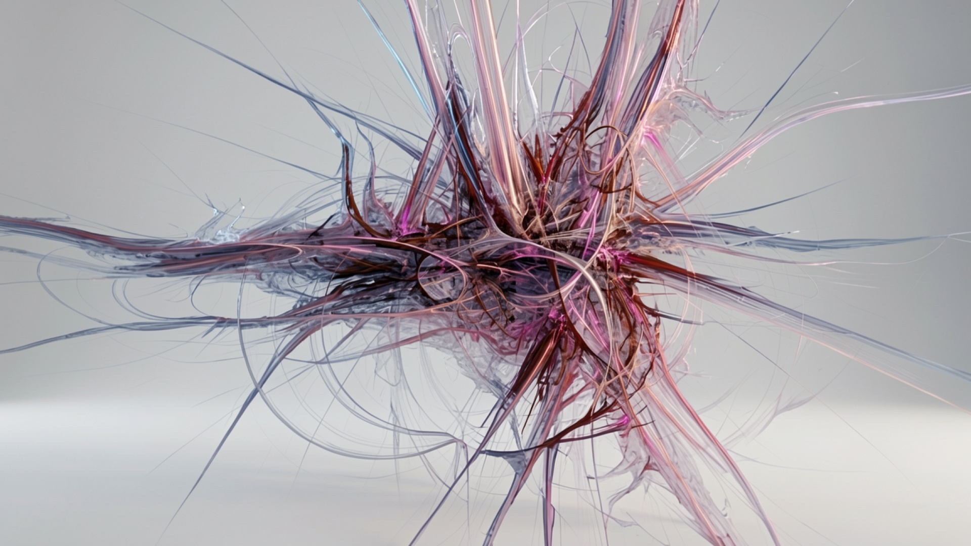 Изображение характеризуется сложным переплетением тонких линий и органических кривых. В центре композиции сосредоточены насыщенные красные и бордовые оттенки, которые плавно переходят в светлые тона по краям. Освещение создает эффект объема за счет мягких бликов на изгибах структур и глубоких теней в узлах пересечения элементов. Фон представляет собой чистый белый градиент, что подчеркивает контрастность центрального объекта. Перед загрузкой доступен удобный предпросмотр для оценки качества отображения на вашем экране.