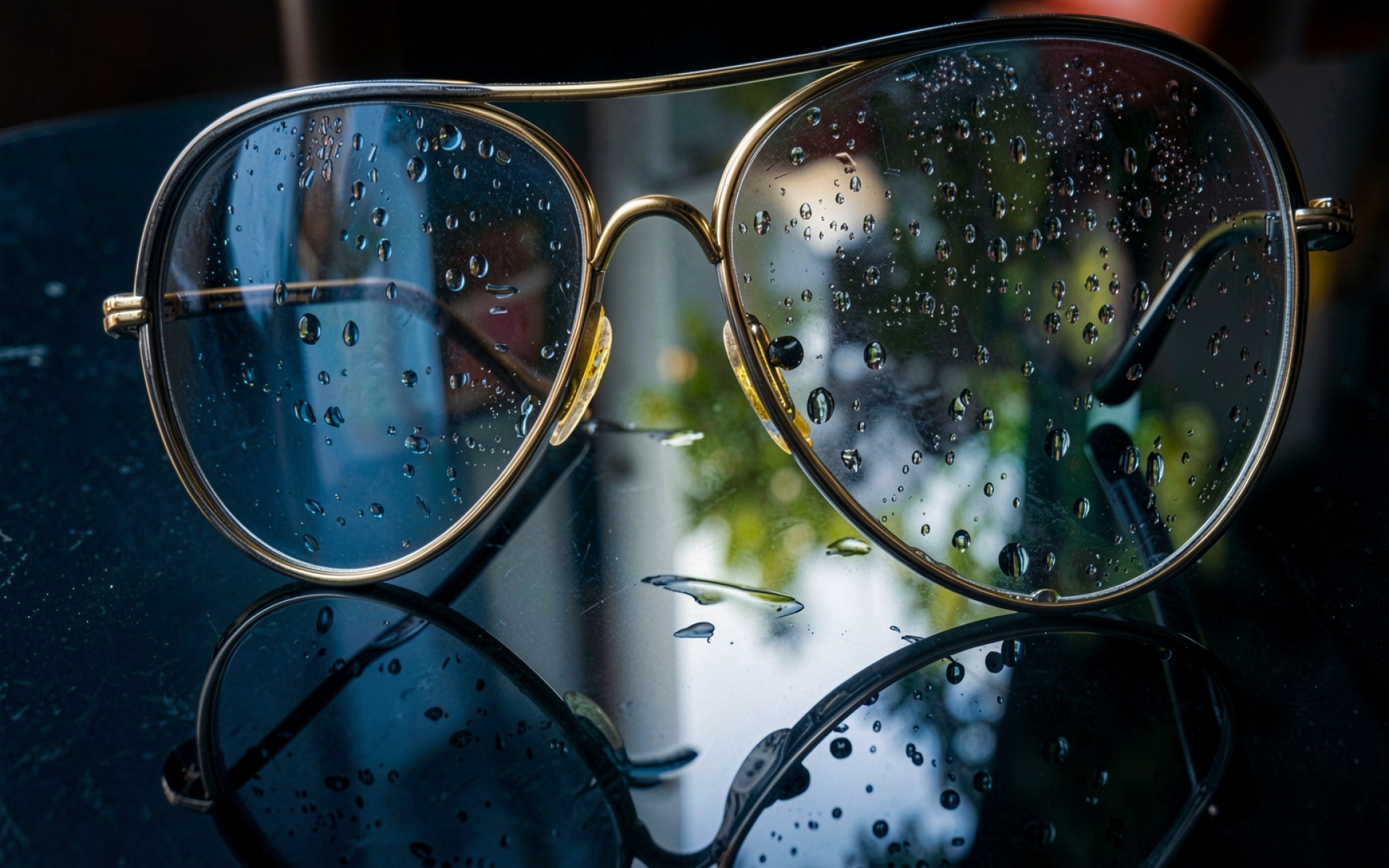 Золотые очки с каплями дождя на стекле обои