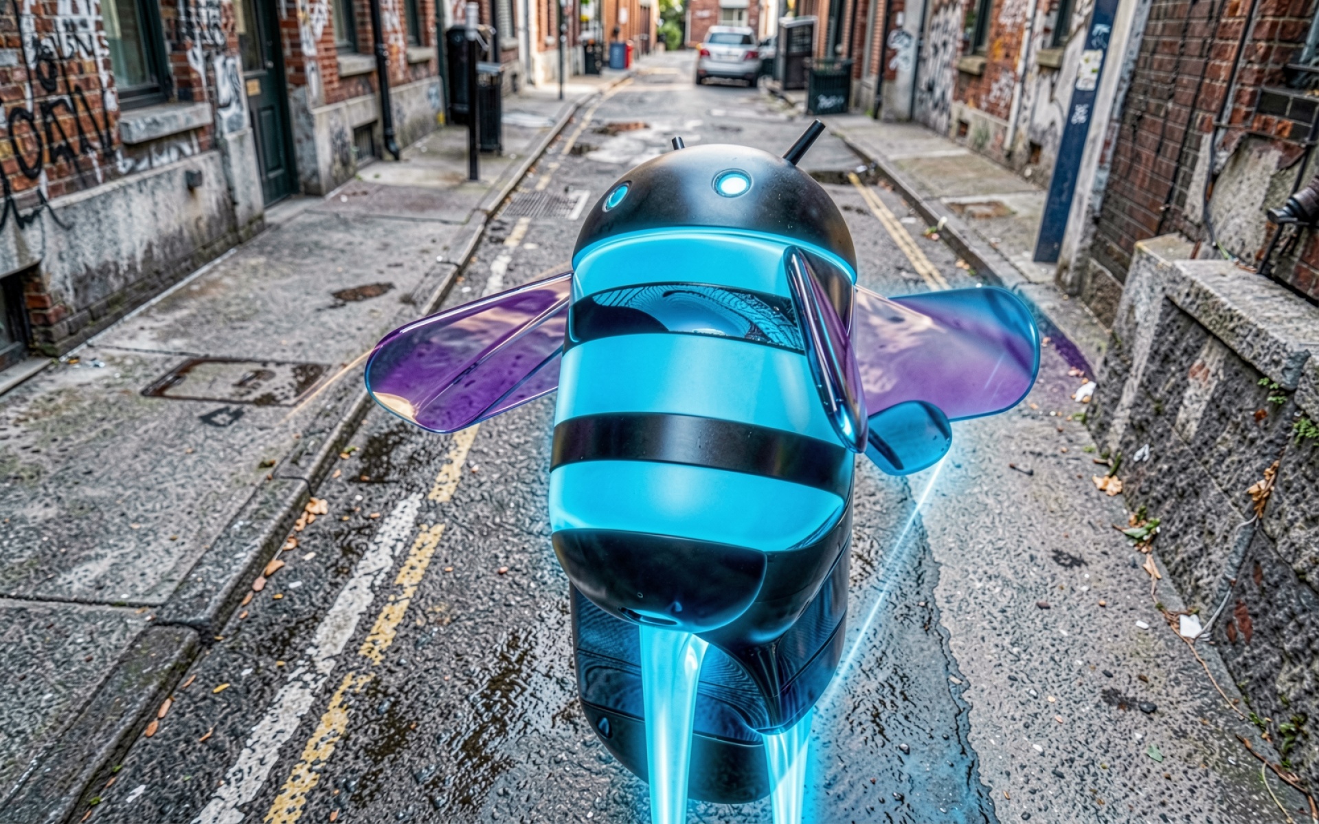 Эта цифровая иллюстрация представляет собой детально проработанного робота-пчелу в урбанистическом окружении, которую стоит скачать для использования в качестве обоев на рабочий стол или в качестве референса для концепт-артов. Изображение сочетает органические формы насекомого с высокотехнологичными материалами и неоновым освещением.