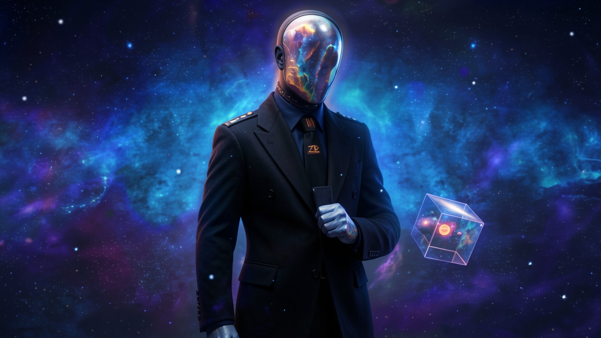 Изображение отличается детальной проработкой текстуры темной ткани пиджака и плавными переходами синих и фиолетовых оттенков в области туманностей. Освещение сосредоточено на стеклянном кубе и лице персонажа, создавая четкие блики и глубокие тени. Фон представляет собой сложный градиент с точечными акцентами звезд. На сайте предусмотрен удобный предпросмотр перед загрузкой для оценки качества на экране.