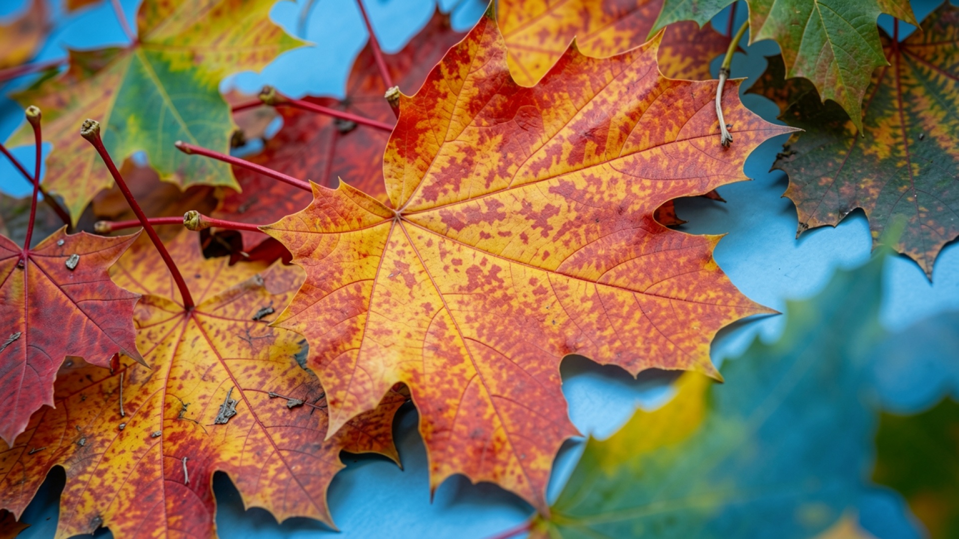 Доступны для скачивания JPG обои 'Осенние кленовые листья на синем фоне'. Почему стоит скачать их? Полная цветопередача сохранена без потери качества.