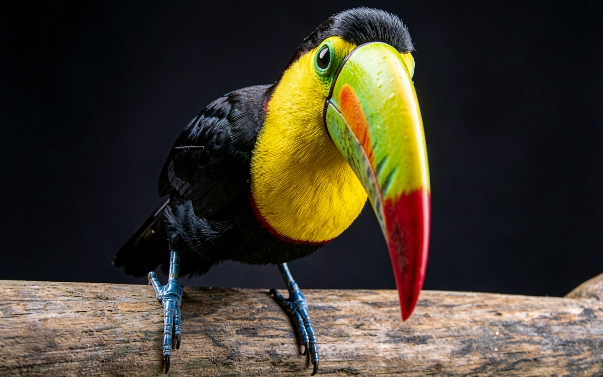 Изображение детально передает текстуру оперения птицы и глянцевую поверхность массивного клюва. Контрастное освещение создает четкие блики на желтых и красных участках, подчеркивая объем объекта на фоне глубокого черного градиента. Особое внимание уделено прорисовке коры дерева с выраженным рельефом и тенями в местах соприкосновения лап с веткой. Сайт предоставляет удобный предпросмотр перед загрузкой для оценки качества отображения на вашем экране.