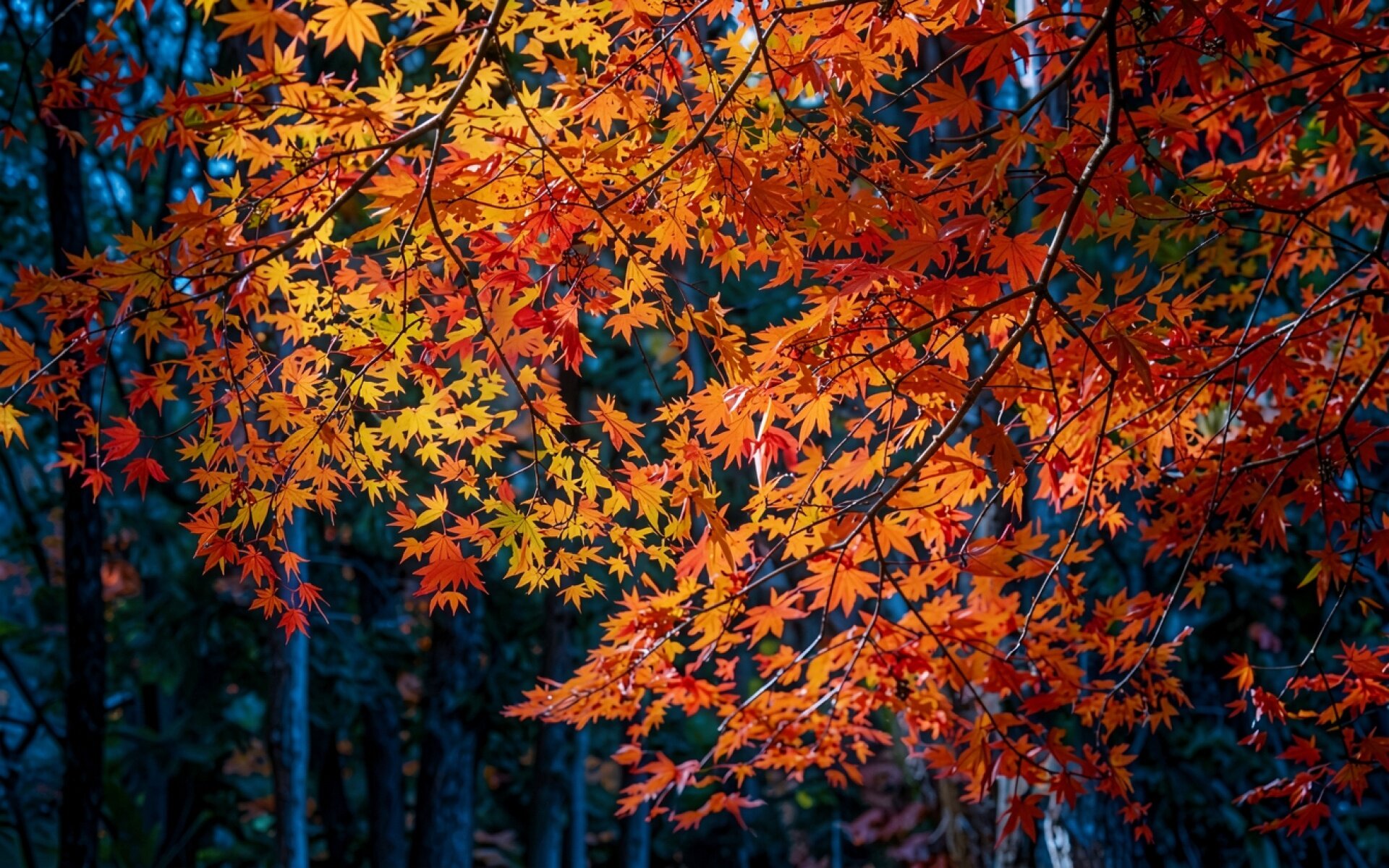 Изображение детально передает текстуру прожилок каждого листа, создавая эффект объема. Контрастное освещение подчеркивает переход от ярко-желтых оттенков к глубокому красному, а мягкие тени в глубине ветвей добавляют сцене глубины. Градиенты фона плавно уходят в темные тона леса, что выделяет передний план. На сайте доступен удобный предпросмотр перед загрузкой для оценки качества на экране.