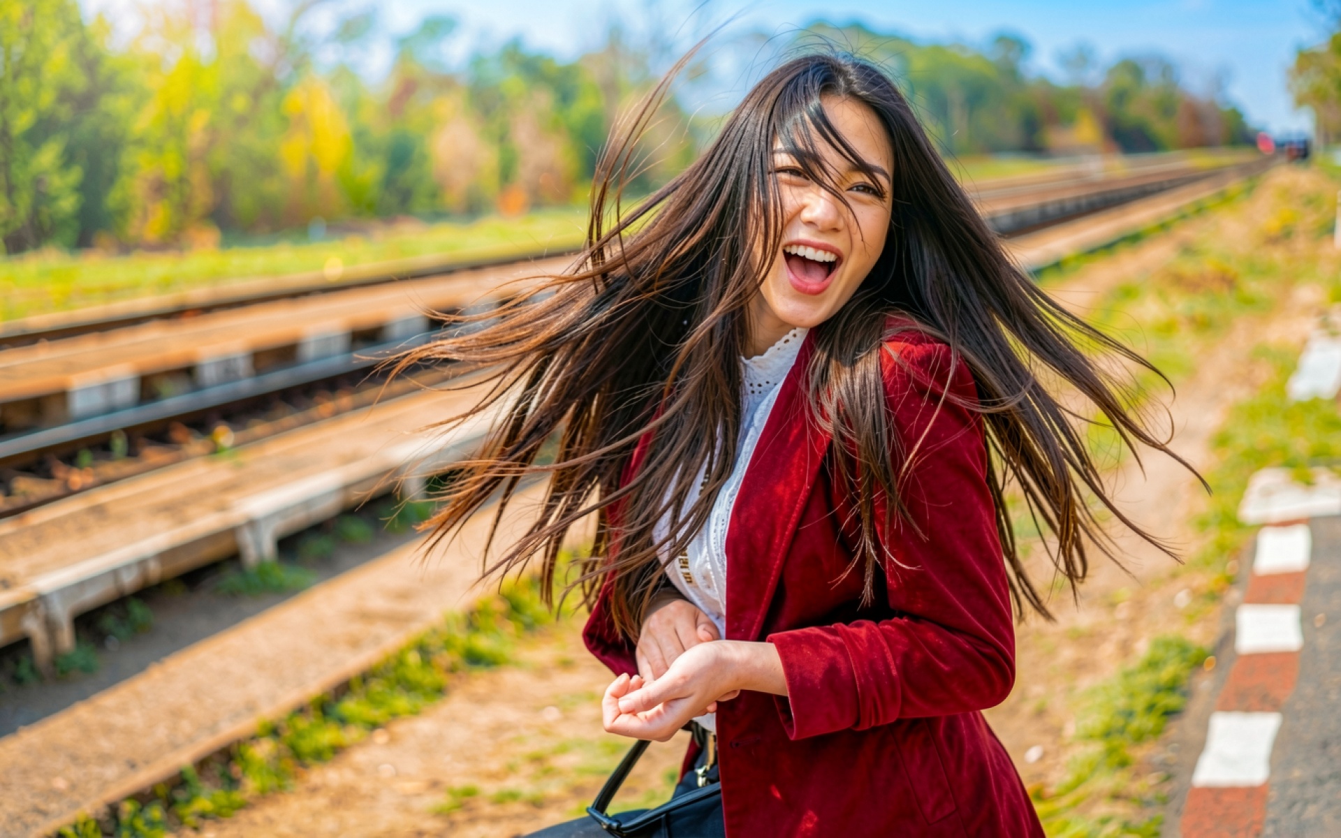 Скачайте с нашего сайта обои Смеющаяся девушка в красном пиджаке у железной дороги в формате JPG, так как они подходят для профессионального редактирования без артефактов.