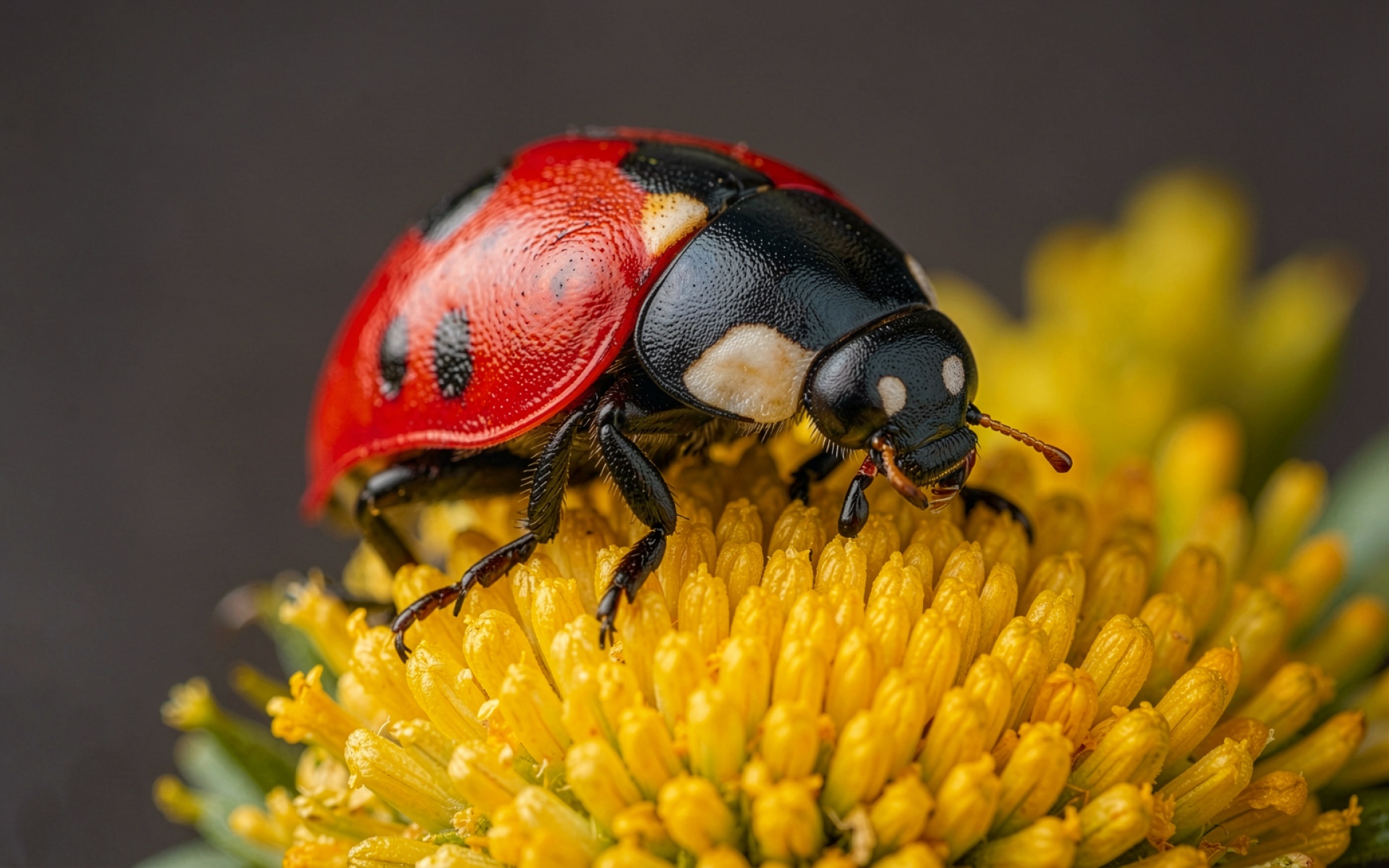 Данный JPG-файл характеризуется минимальным коэффициентом сжатия, что исключает появление артефактов вокруг контрастных границ. Изображение выполнено в цветовом пространстве sRGB с глубиной цвета 8 бит на канал, обеспечивая корректную передачу насыщенного красного и желтого спектров. Высокая детализация текстуры панциря и тычинок цветка достигнута за счет отсутствия бэндинга в градиентах фона. Файл полностью совместим с любым современным графическим редактором и просмотрщиком.
