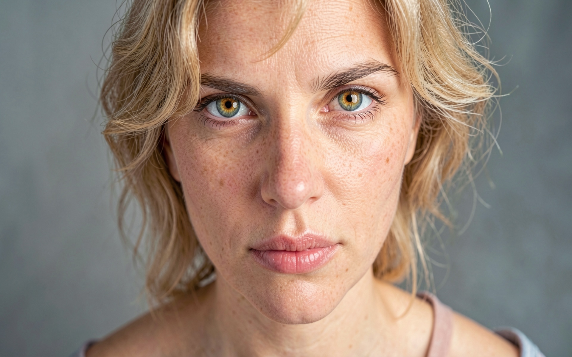 Изображение отличается детальной проработкой текстуры кожи и естественным распределением веснушек. Мягкое фронтальное освещение создает плавные переходы теней в области скул и подчеркивает радужку глаз. Фон имеет нейтральный серый градиент, который выделяет золотистые оттенки волос. На сайте доступен удобный предпросмотр перед скачиванием для оценки качества на экране.