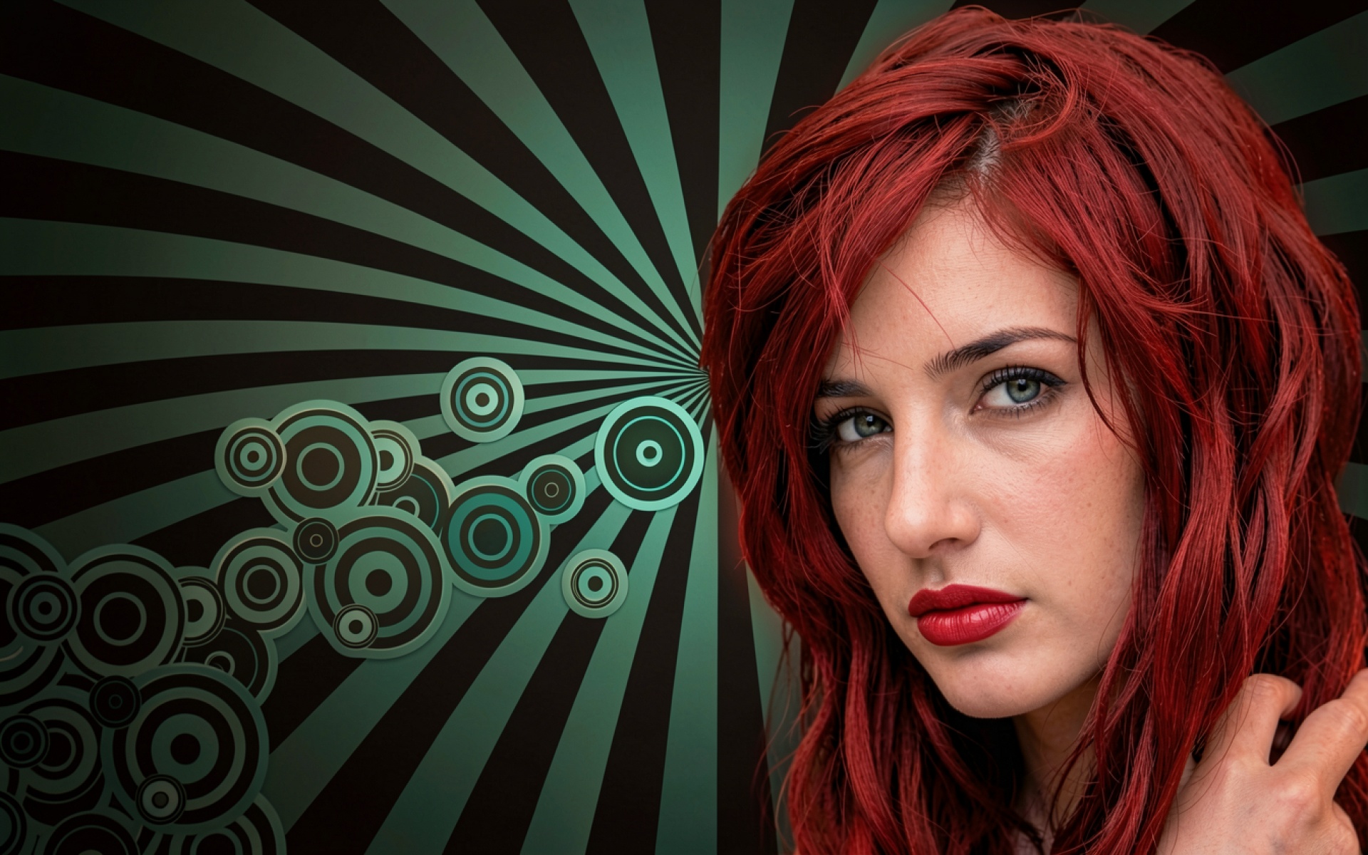 Девушка с красными волосами на бирюзовом фоне обои