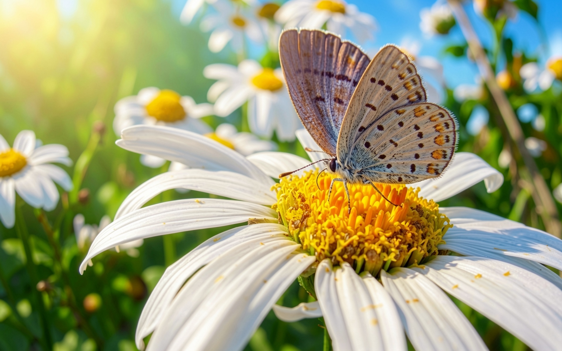 Скачайте с нашего сайта обои Голубая бабочка на белой ромашке в солнечный день в формате JPG, так как альтернативы сильнее сжимают изображение, а мы предоставляем оригинал.
