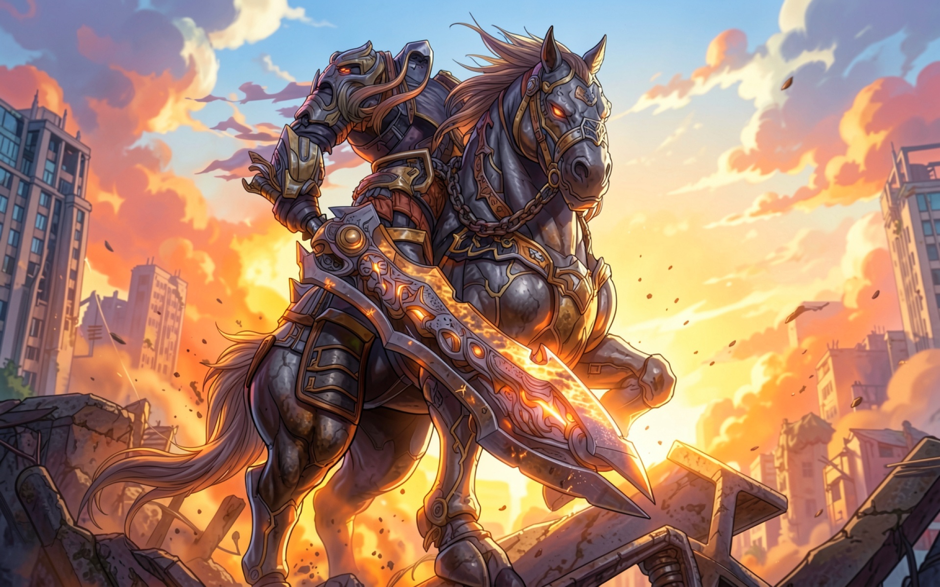Изображение отличается детальной проработкой металлических доспехов и текстуры кожи коня. Освещение имитирует контровой свет заходящего солнца, создавая яркие блики на гранях меча и глубокие тени в развалинах зданий. Градиенты неба переходят от насыщенного оранжевого к мягкому голубому, что подчеркивает силуэт главного героя. На сайте предусмотрен удобный предпросмотр перед загрузкой для оценки качества отображения на экране.