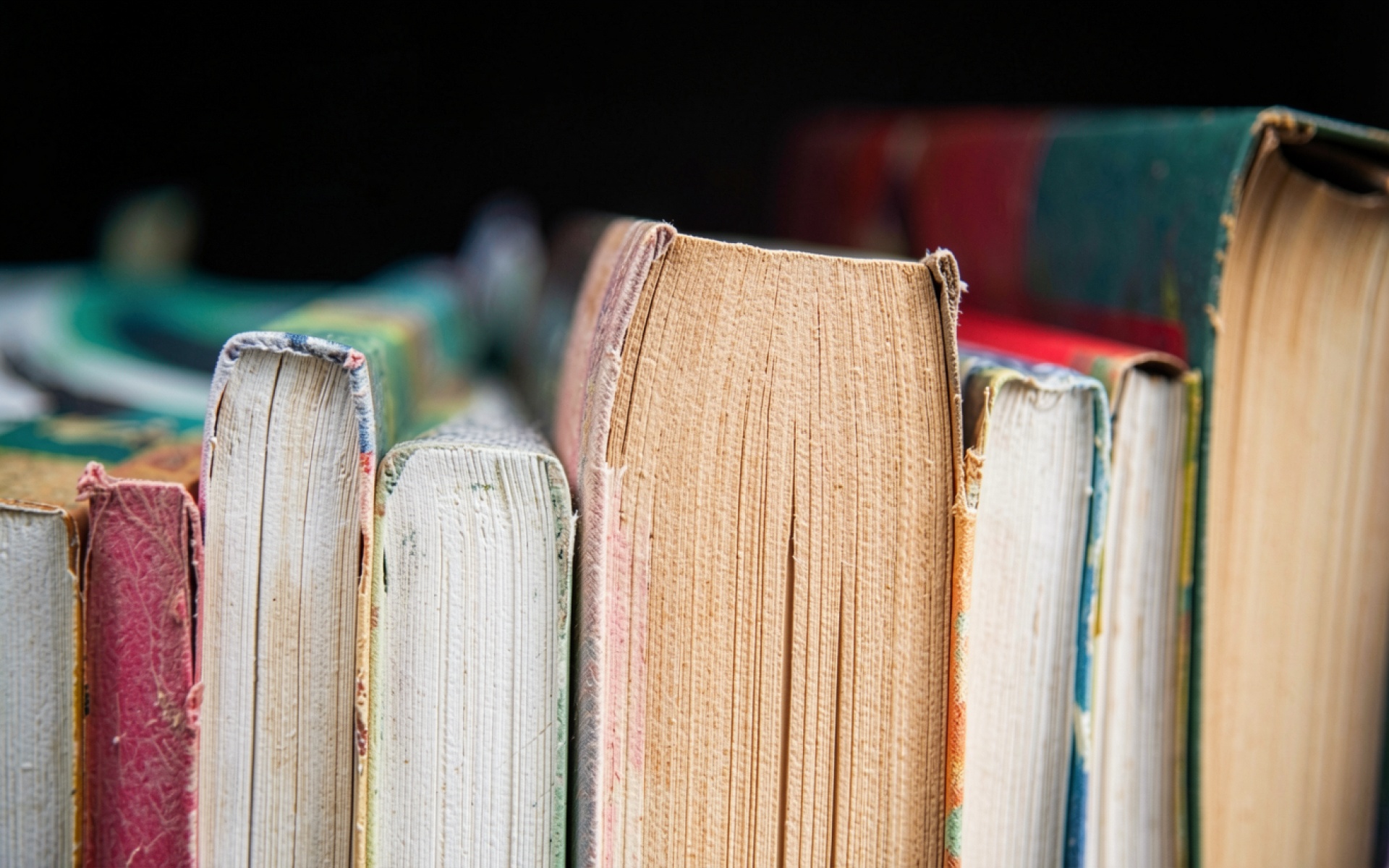 Техническое исполнение кадра акцентирует внимание на пористой текстуре книжных страниц и потертостях переплетов. Освещение направленное, создающее глубокие тени между корешками и мягкие блики на верхних срезах бумаги. Градиенты фона плавно уходят в черный цвет, что выделяет теплые бежевые и приглушенные красные тона объектов. На сайте доступен удобный предпросмотр перед загрузкой для оценки качества отображения на вашем экране.