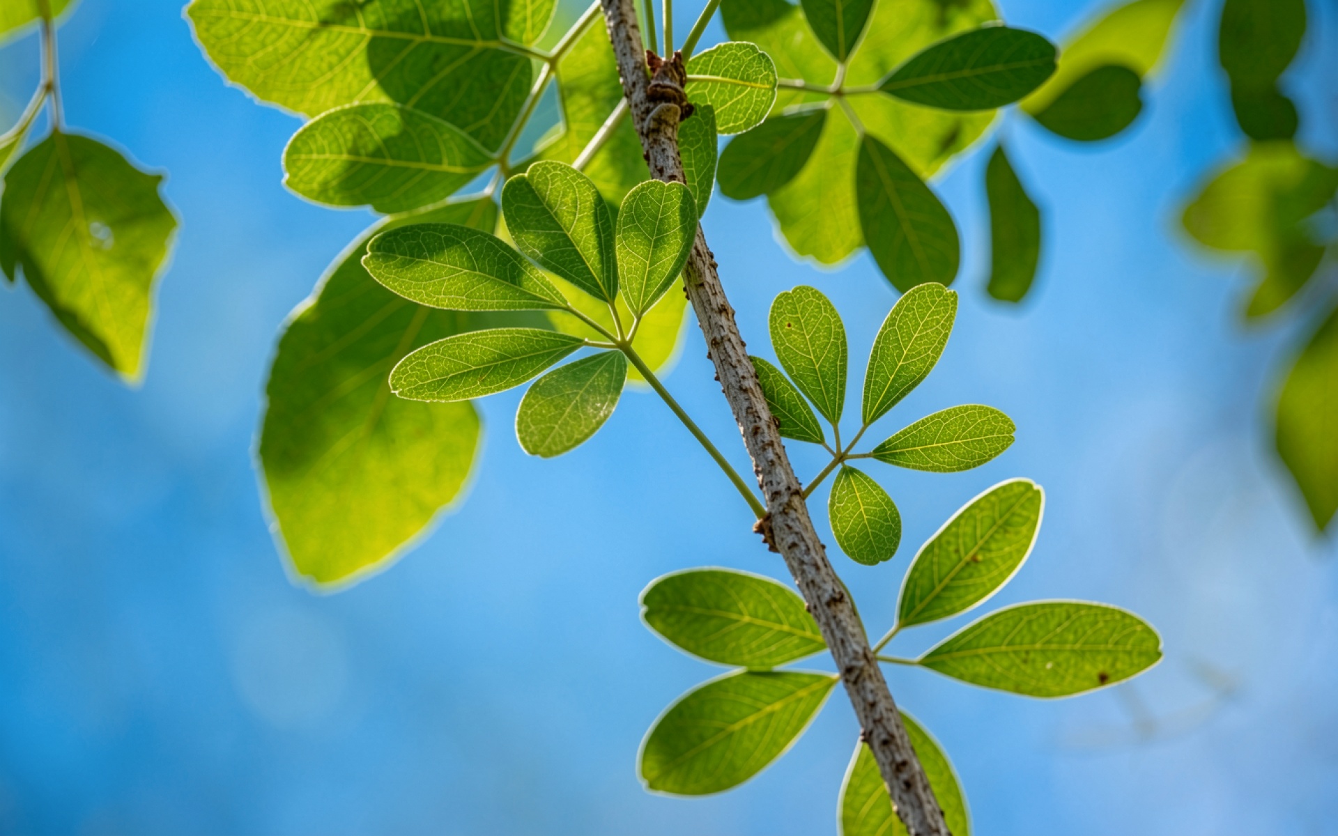 Изображение детально передает структуру листовых пластин и прожилок, которые становятся отчетливо видны благодаря контровому освещению. Мягкие градиенты синего фона создают контраст с насыщенным зеленым цветом листвы, а естественные тени на ветке подчеркивают объем органических форм. На сайте доступен удобный предпросмотр перед скачиванием для оценки качества отображения на экране.