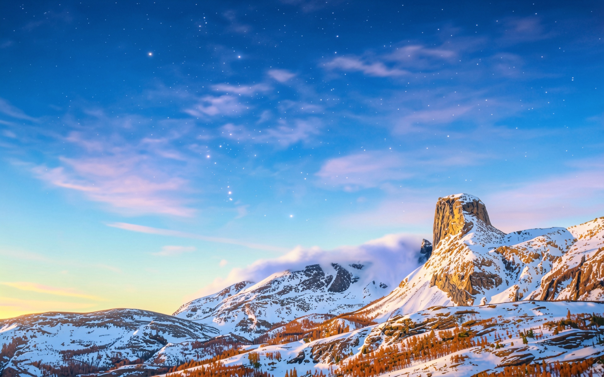 Доступны для скачивания JPG обои Заснеженные горы под звездным ночным небом. Почему стоит скачать их? Здесь нет полосатого градиента из-за низкого битрейта.
