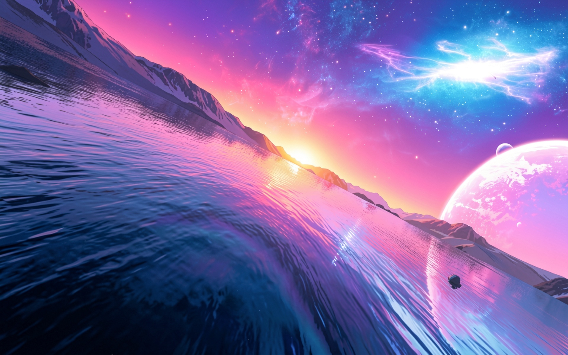 Техническое исполнение работы акцентирует внимание на плавных градиентах неба и зеркальных отражениях на поверхности воды. Освещение сосредоточено в центре композиции, создавая яркий контраст между светящимся горизонтом и глубокими тенями горных хребтов. Текстуры водной глади переданы через четкие блики и ритмичные волны, а мягкое рассеивание света вокруг планеты добавляет глубины пространству. Перед загрузкой на сайте доступен удобный предпросмотр для оценки качества отображения на вашем экране.