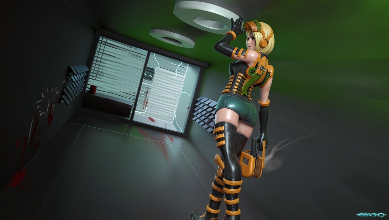 Композиция выполнена с использованием широкого угла а, который подчеркивает геометрию футуристического помещения. Технические параметры изображения включают высокую плотность пикселей и глубокую проработку текстур латекса и металла. Цветовая палитра базируется на комплементарных оттенках зеленого и оранжевого, что соответствует принципам колористики в цифровом искусстве, описанным на artstation.com. Освещение имитирует встроенные потолочные панели, создавая мягкие градиенты на коже и одежде персонажа.